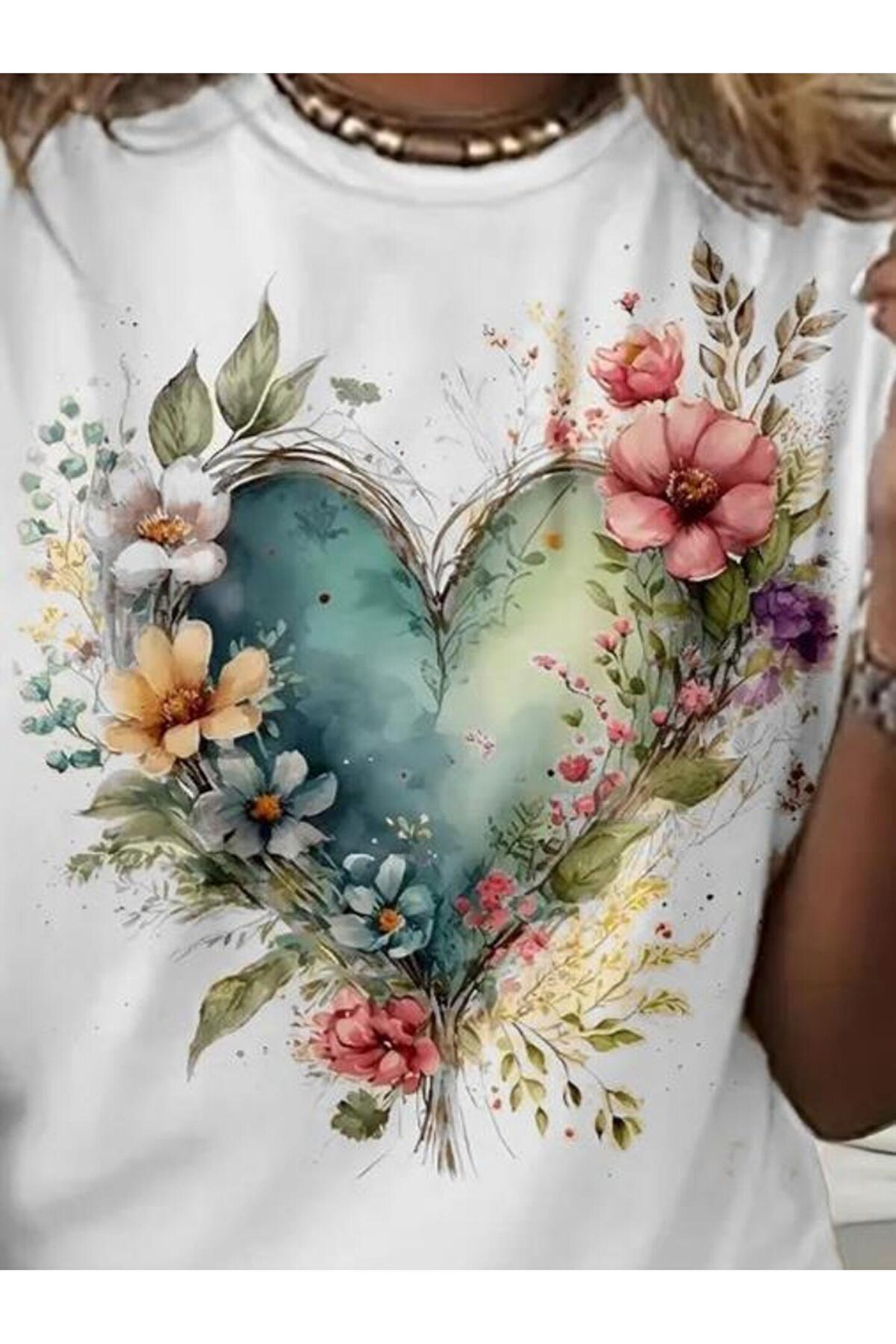 Kadın Kısa Kollu Bisiklet Yaka Kalp Desenli Süprem Bluz