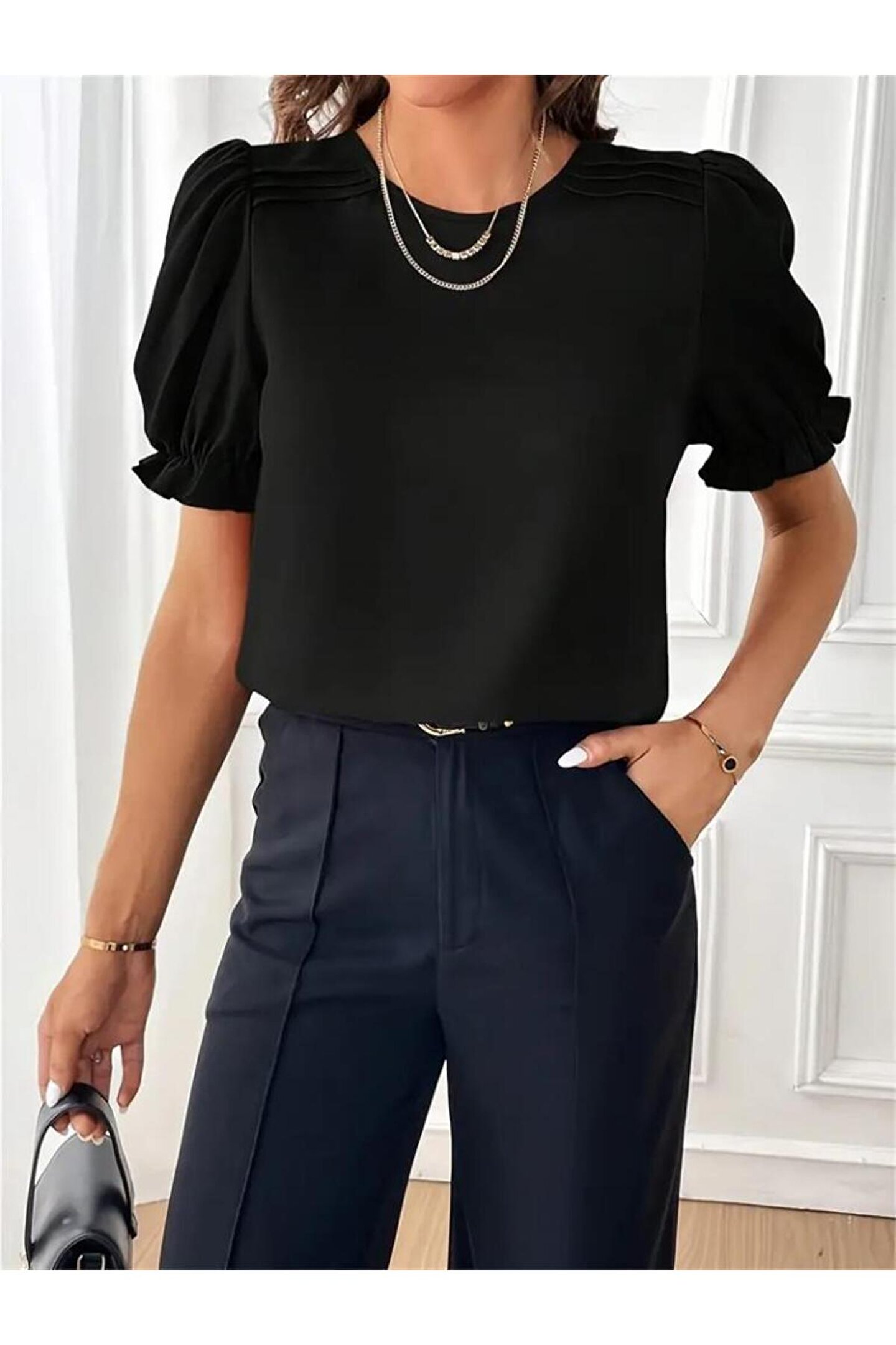 Kadın Kısa Kollu Bisiklet Yaka Kolları Gipeli Ithal Krep Bluz