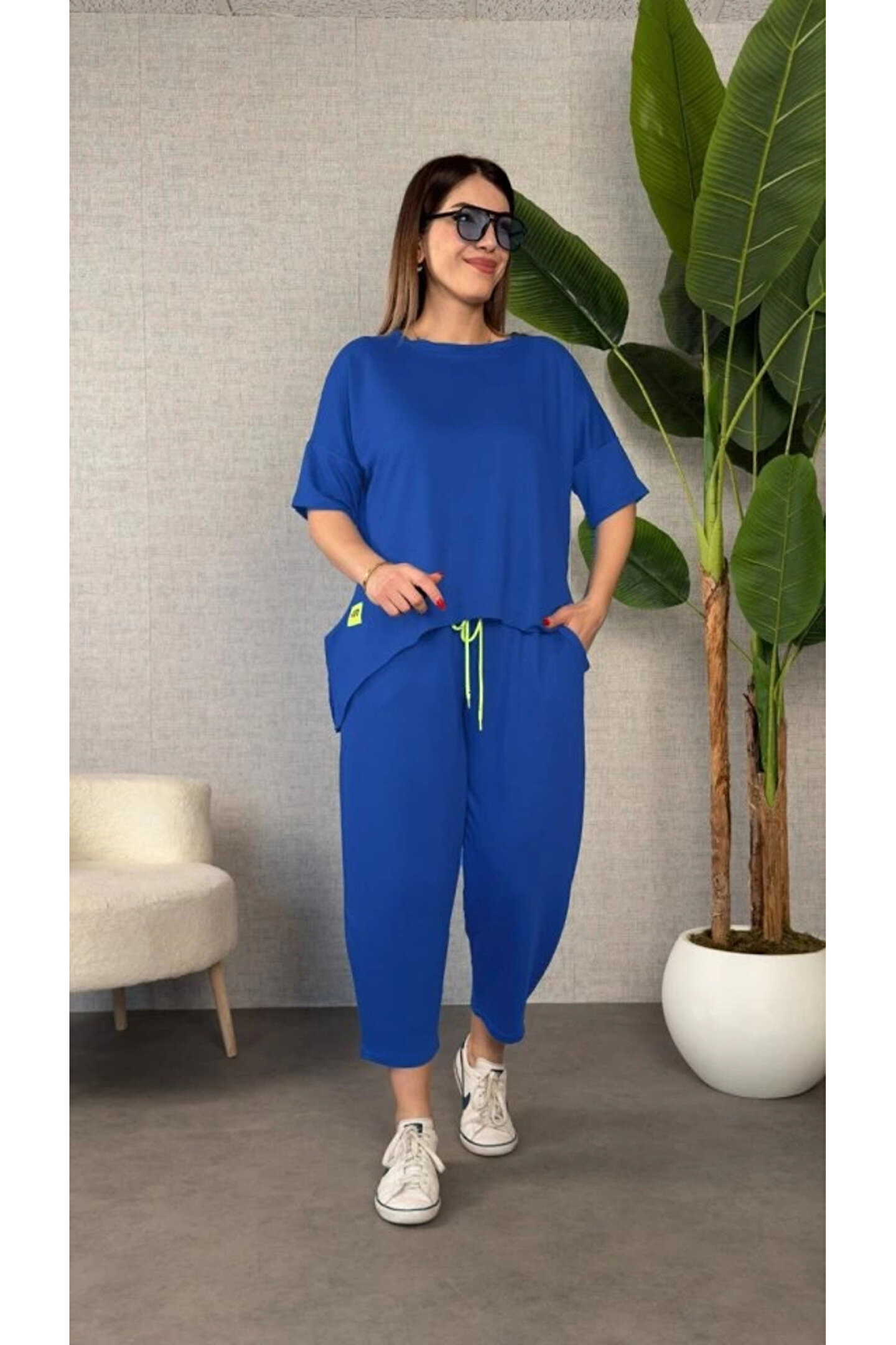 Kadın Kısa Kollu Bisiklet Yaka Viskon Iki Iplik Bluz Ve Pantolon Ikili Takım