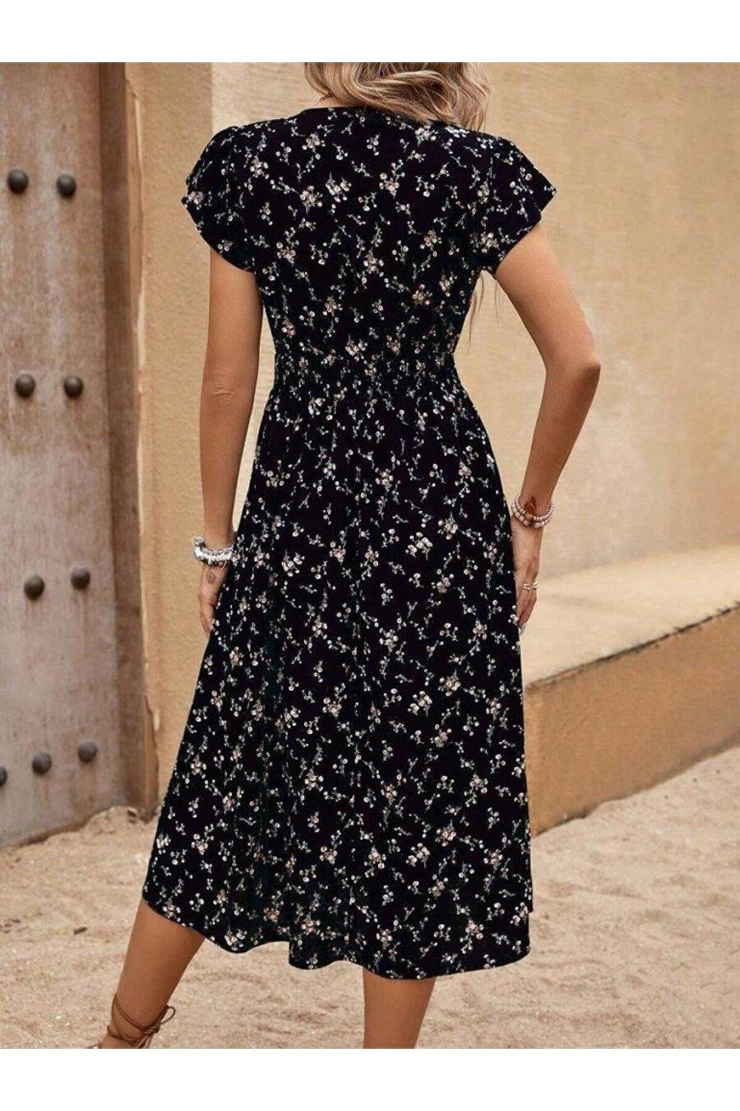 Serero Kadın Kısa Kollu V Yakalı Beli Lastikli çiçek Desenli Süprem Elbise
