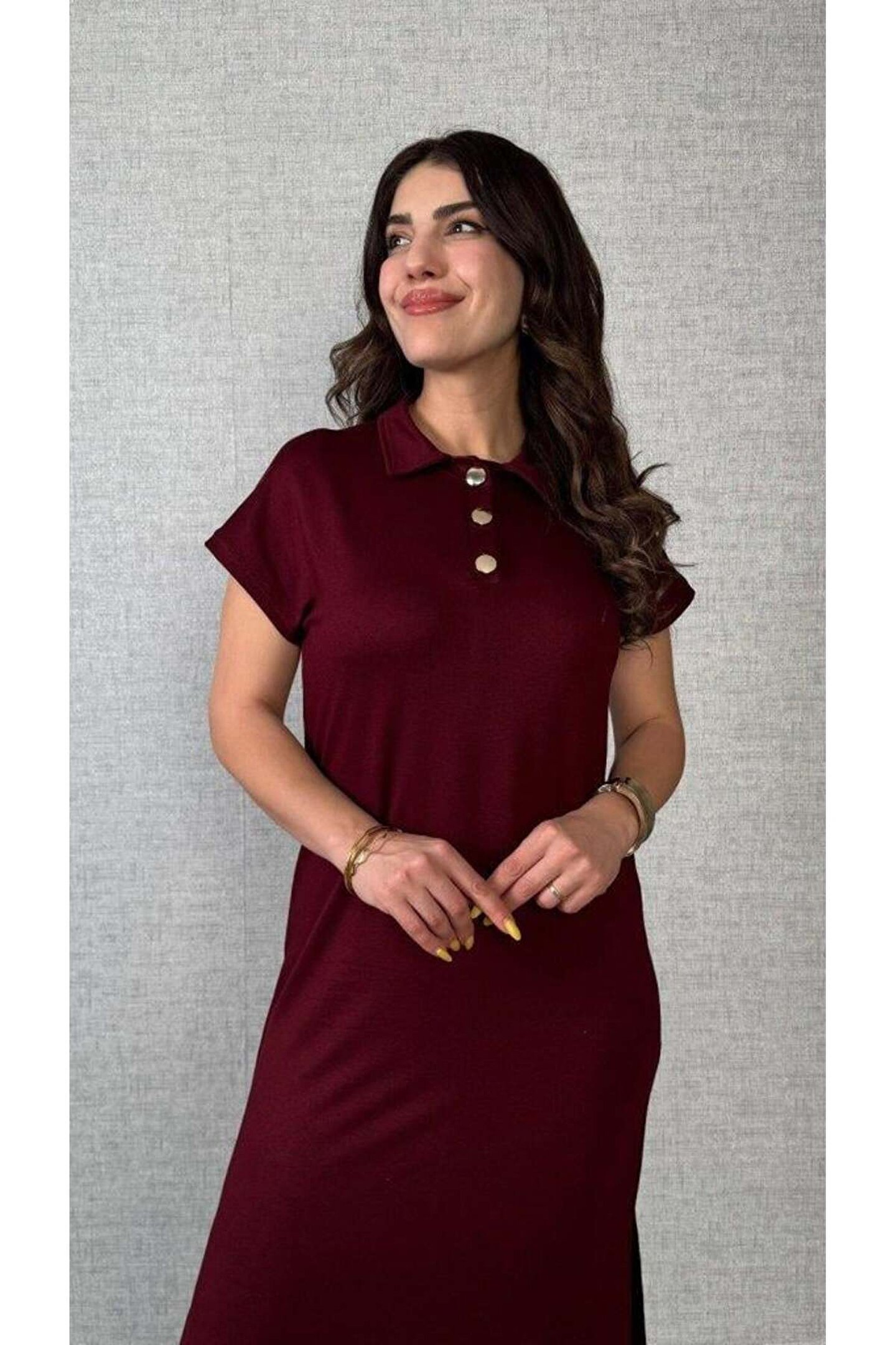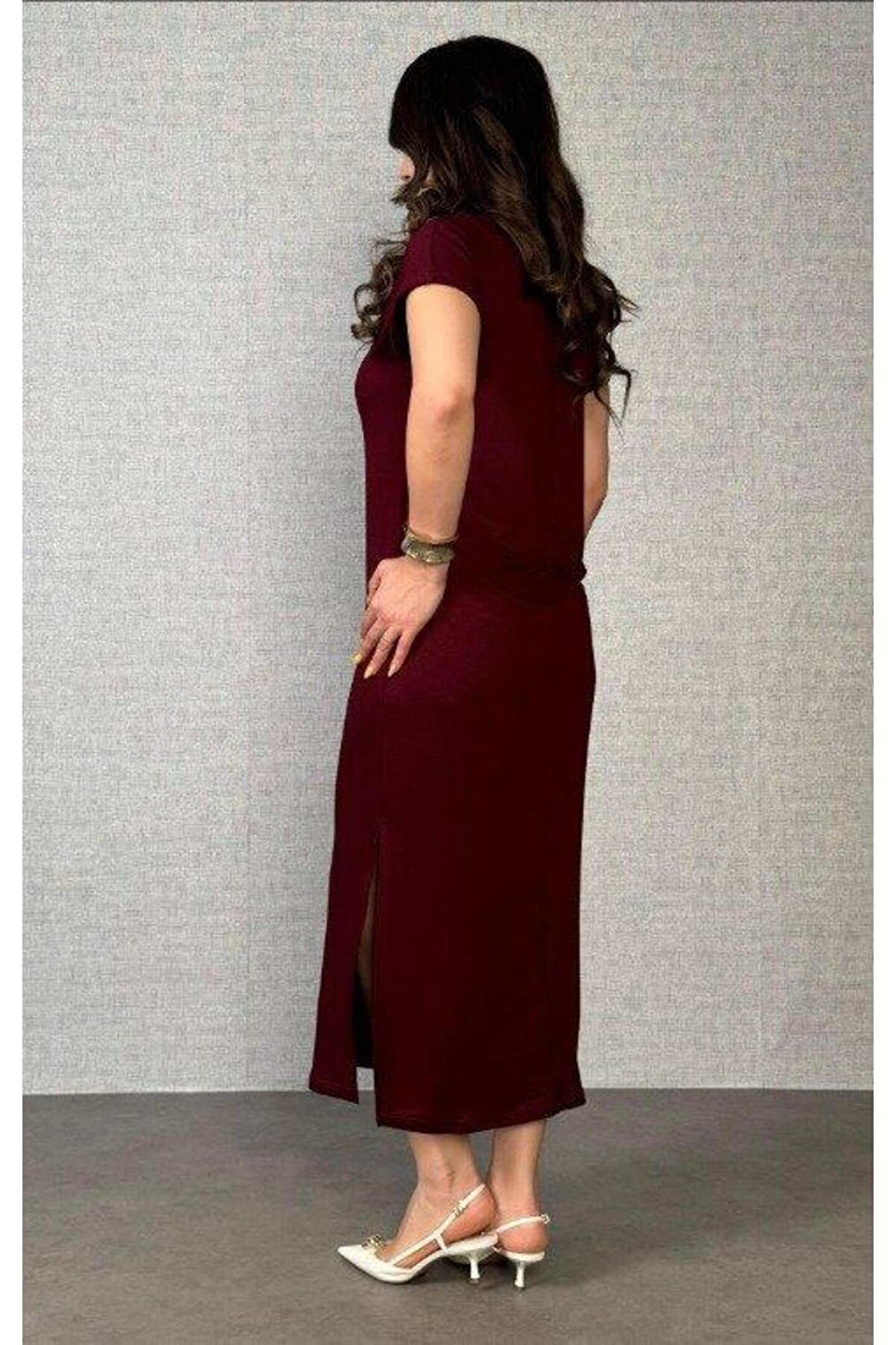 Kadın Kısa Kollu Yakalı Yandan Yırtmaçlı Viskon Iki Iplik Elbise