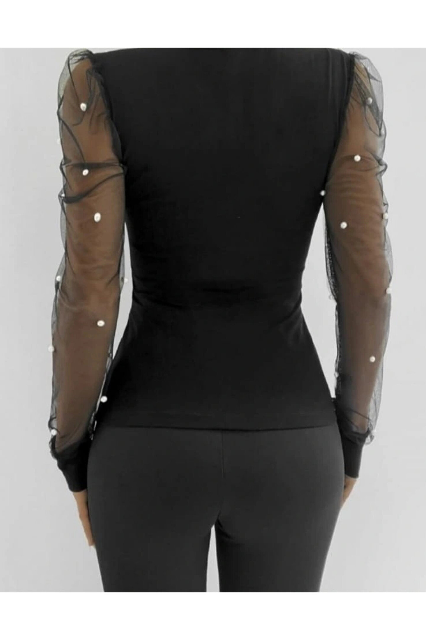 Kadın Uzun Kollu Inci Detaylı Tüllü Viskon Bluz
