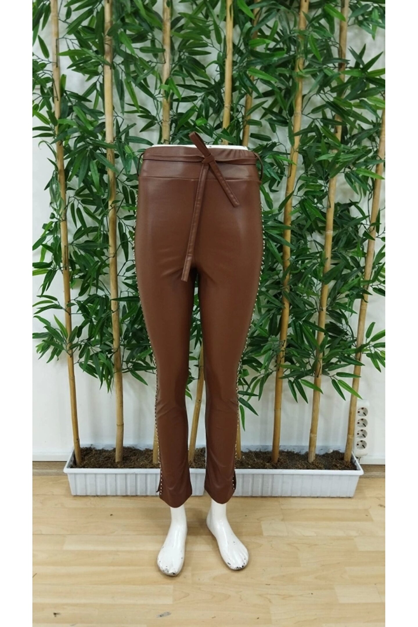 Serero Kadın Yüksek Bel Yanlardan Incili Yırtmaçlı Uzun Deri Tayt