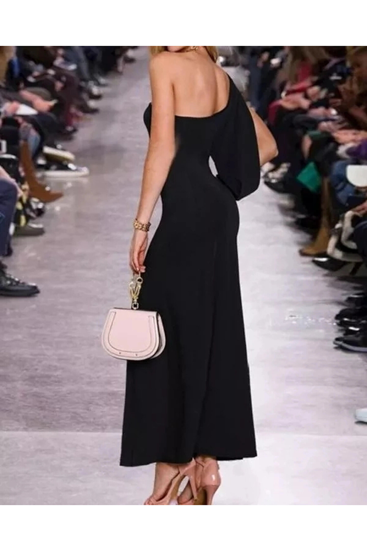 Serero Tek Omuz Açık Derin Yırtmaçlı Krep Tam Boy Elbise