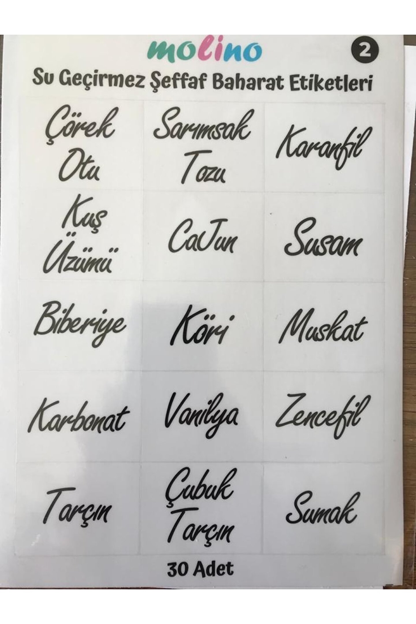30 Adet Suya Dayanıklı Etiket Seti.; ; Etiketler şeffaftır, solma ve silinme yapmaz.; Özel tasarım etiketler kavanozlarınıza estetik katacaktır.; (Görseldeki kavanoz görsel amaçlıdır sadece 30 adet etiket gönderilmektedir) ; TUZ, KARABİBER, PUL BİBER, KİMYON, KEKİK, TOZ BİBER, NANE, İSOT, KÖFTE BAHARATI, HAŞHAŞ, KİŞNİŞ, ZERDEÇAL, HİNDİSTAN CEVİZİ, YENİ BAHAR, KAKAO, ÇÖREK OTU, SARIMSAK TOZU, KARANFİL, KUŞ ÜZÜMÜ, CAJUN, SUSAM, BİBERİYE, KÖRİ, MUSKAT, KARBONAT, VANİLYA, ZENCEFİL, TARÇIN, ÇUBUK TARÇIN, SUMAK.;