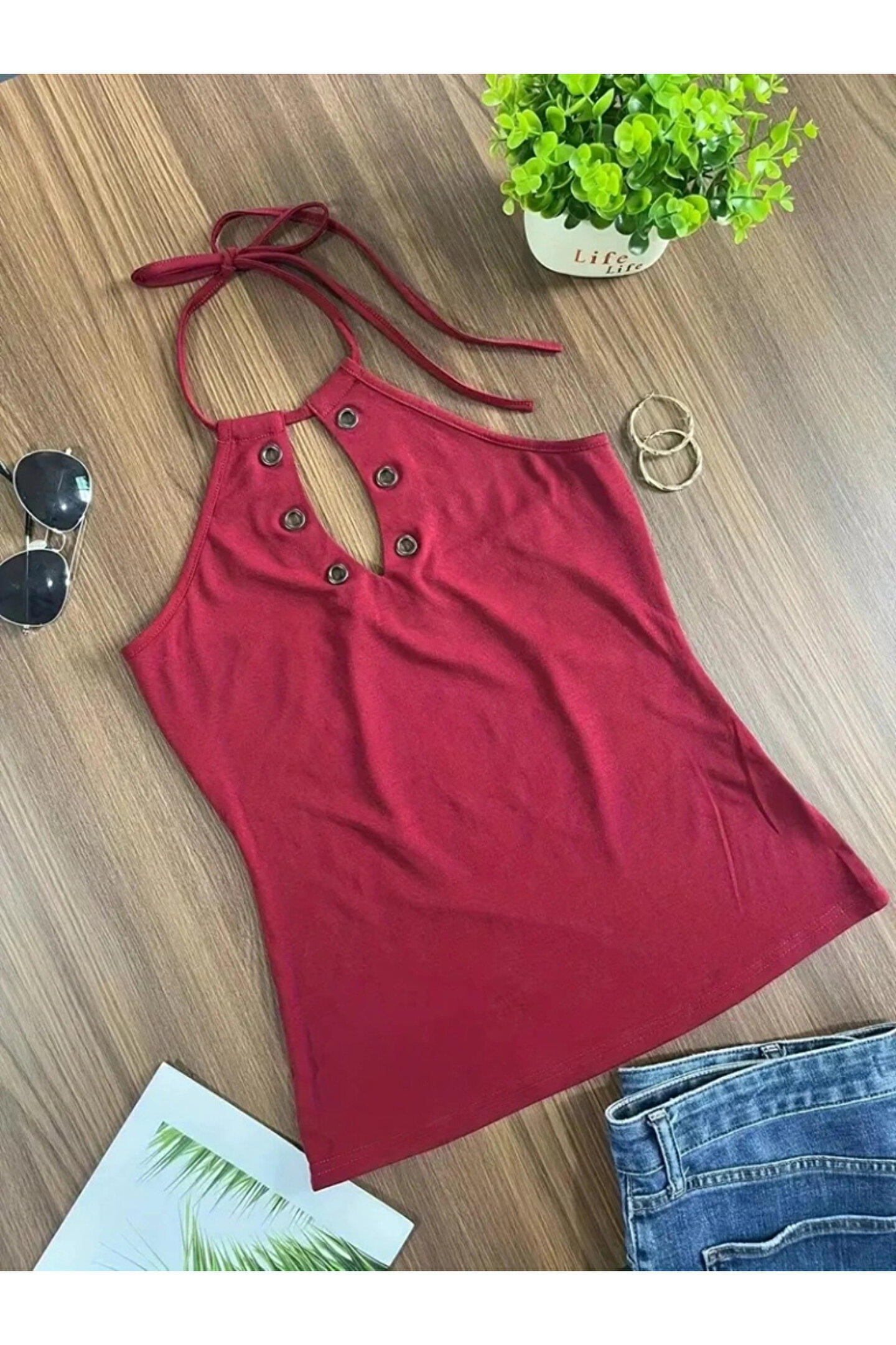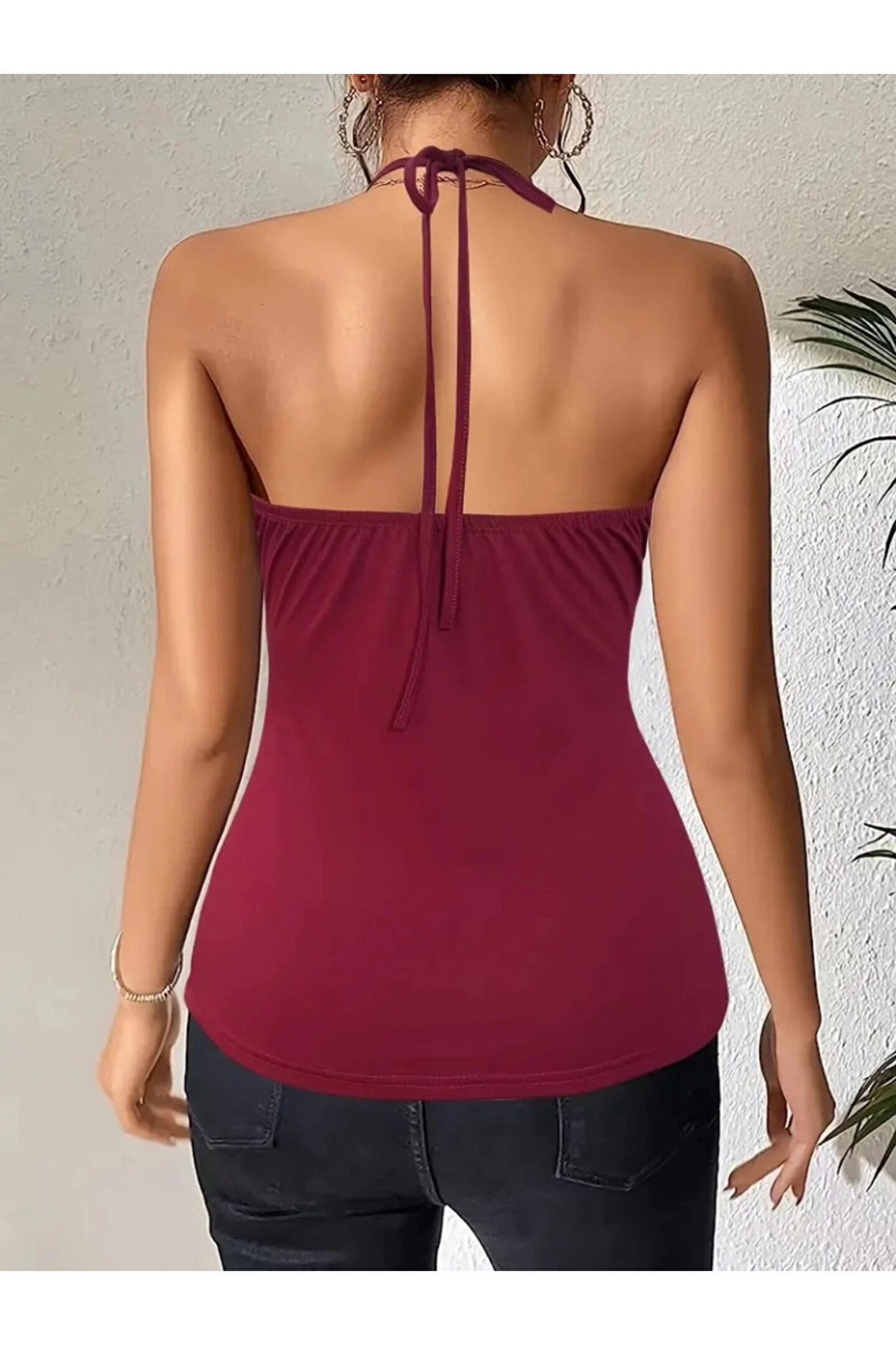 Kadın Askılı Kuş Gözü Ve Dekolte Detay Boyundan Bağlamalı Viskon Bluz