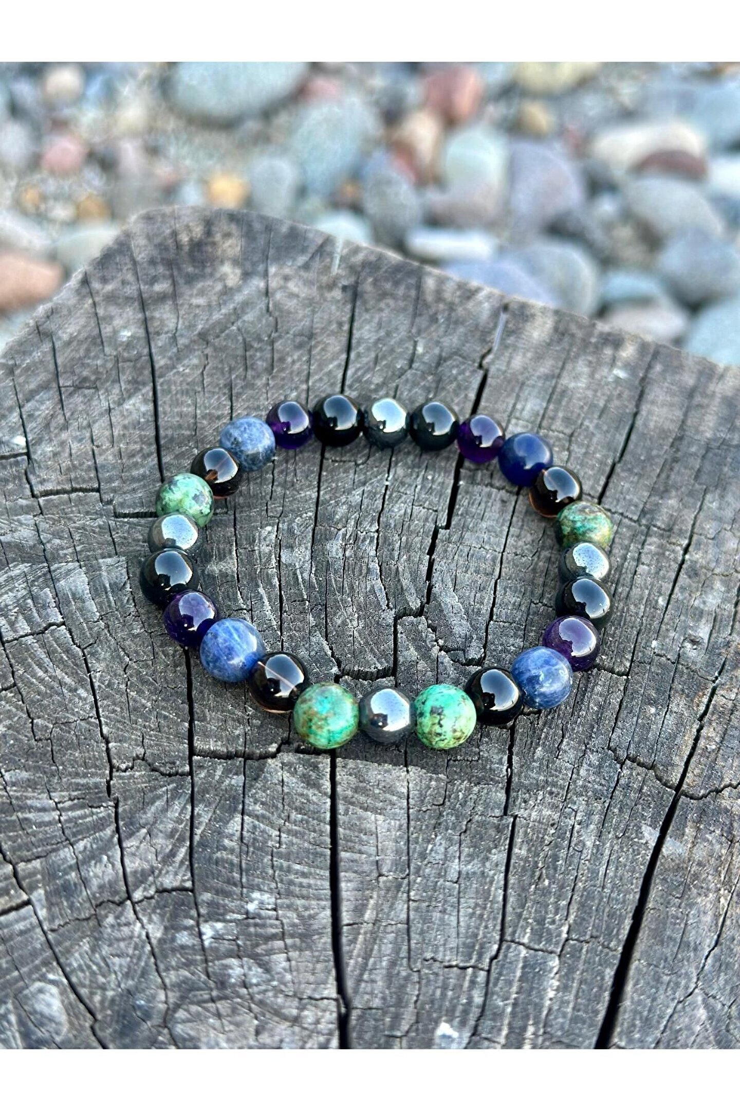 sezaiiletişim 8mm Yay Burcu doğaltaş bileklik, Ametist-Dumanlı Kuvars-Sodalit-A.Turkuaz (Firuze)-Obsidyen-Hematit