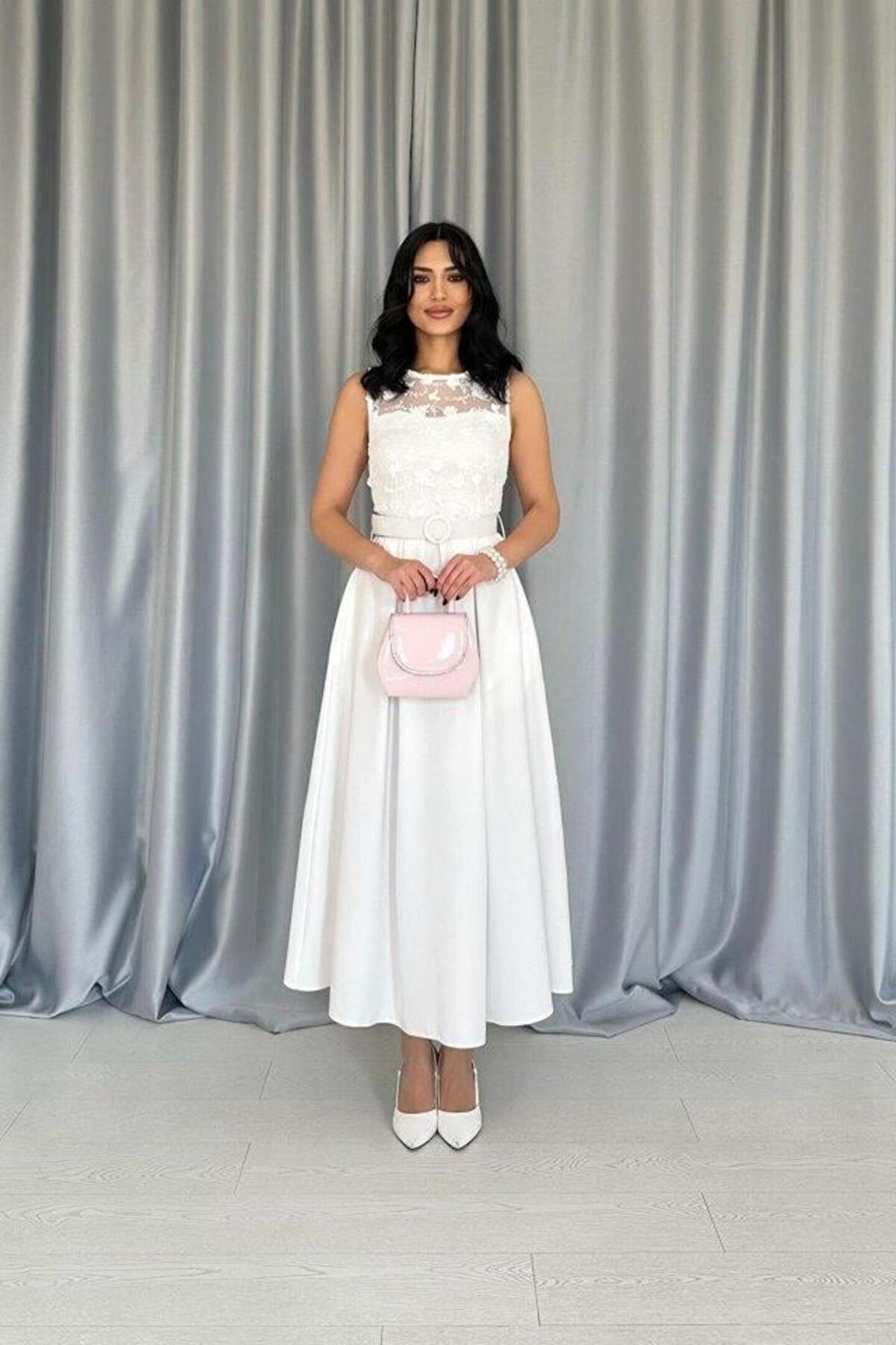 SGM BUTİK Beyaz Önü Dantel Detaylı Kemerli Elbise
