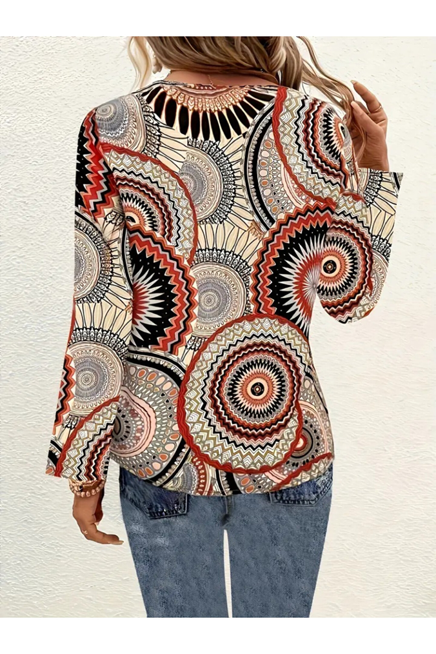 Kadın Uzun Kollu V Yakalı Desenli Süprem Bluz