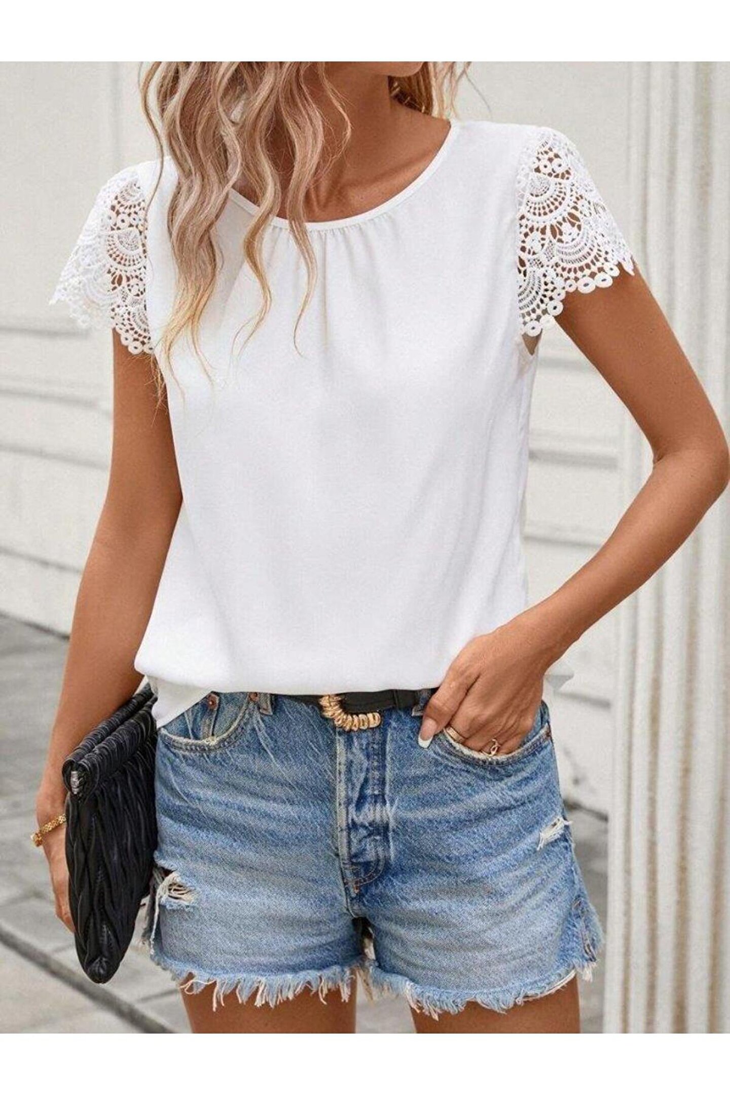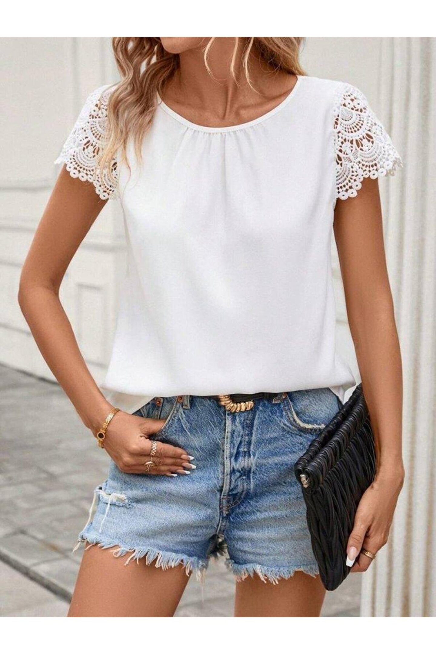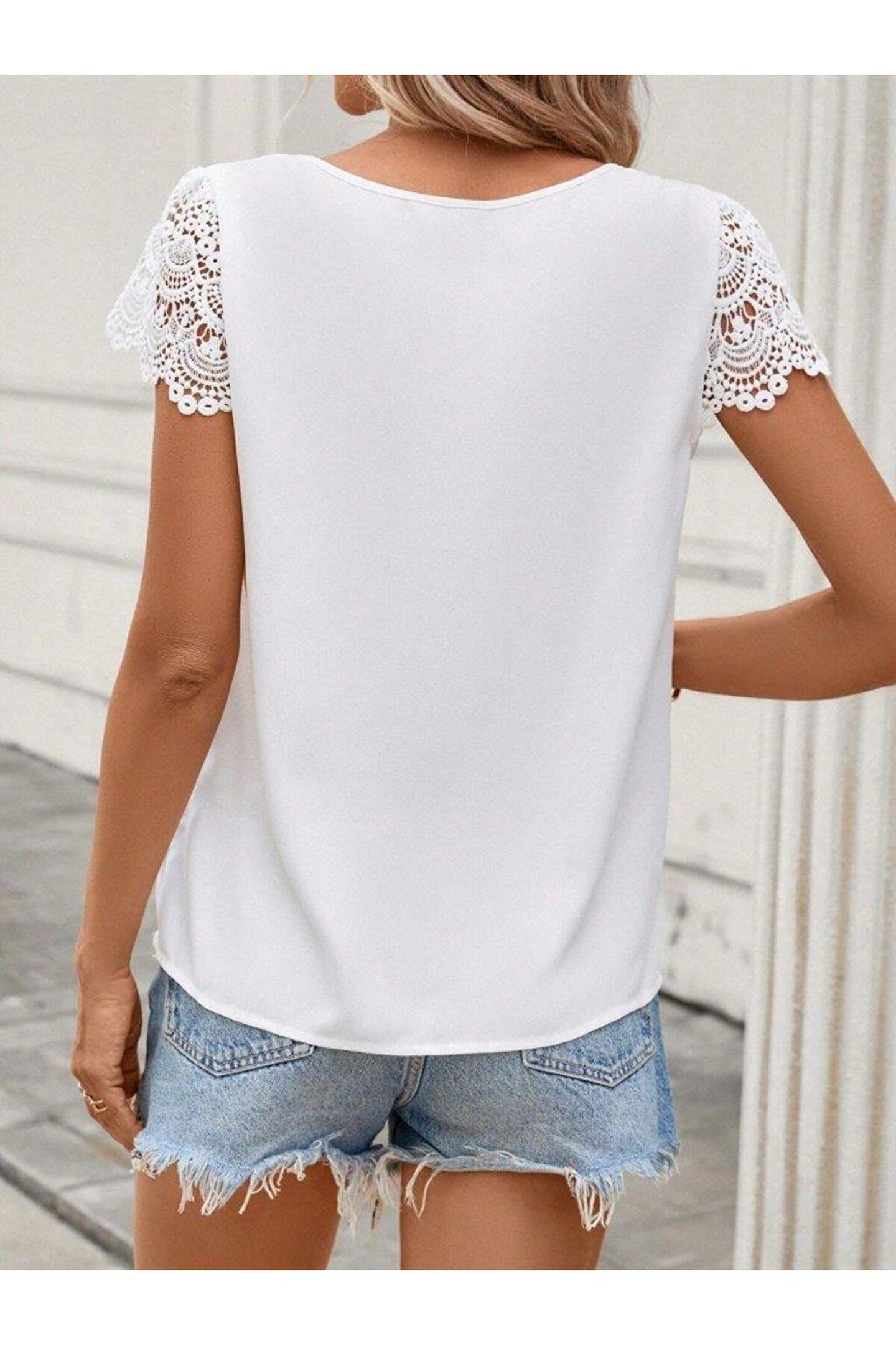 SGM BUTİK Kadın Kısa Dantel Kollu Bisiklet Yaka Sandy Bluz