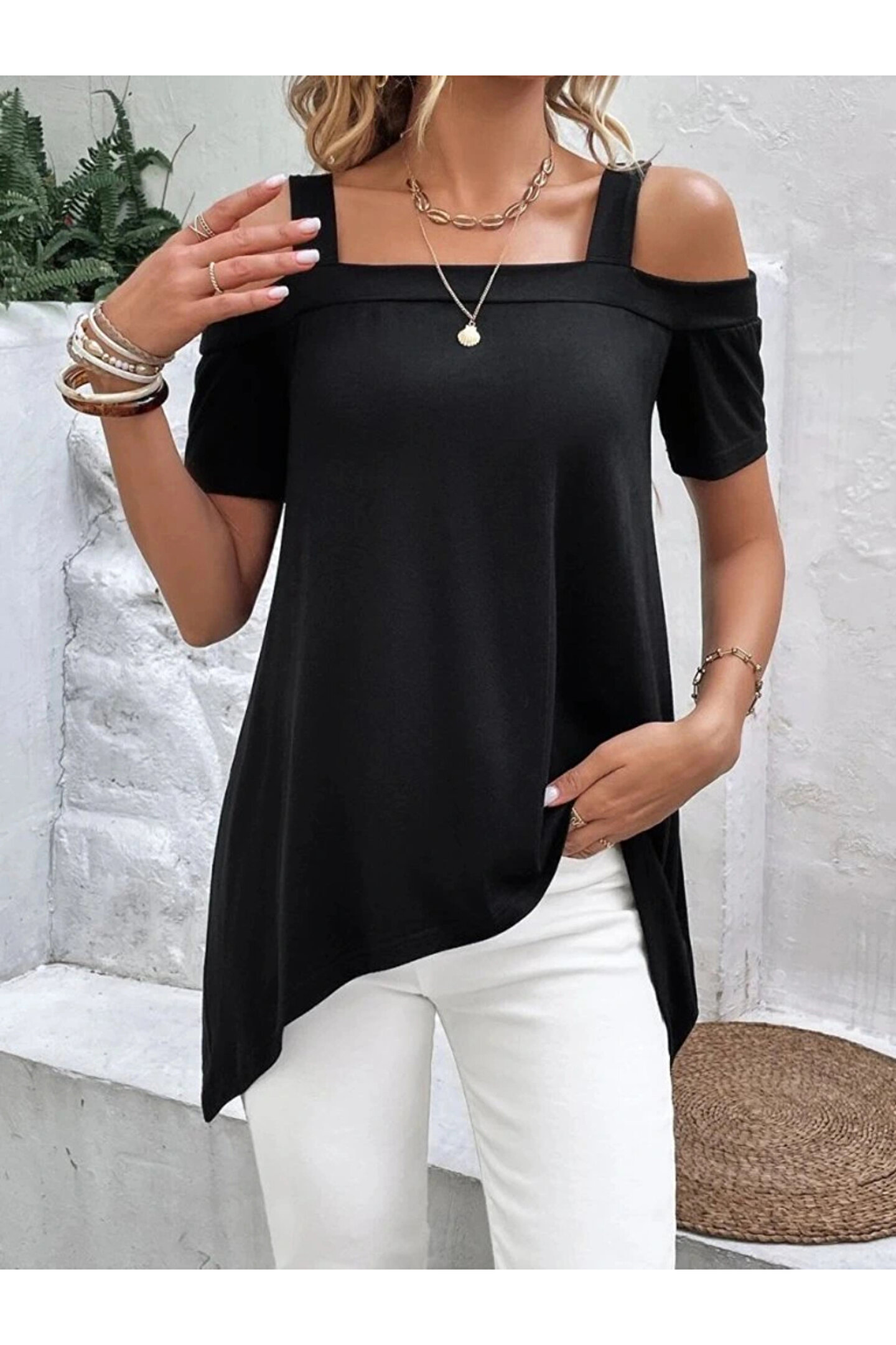 SGM BUTİK Kadın Kısa Kollu Omuzlardan Açık Askılı Asimetrik Kesim Viskon Bluz
