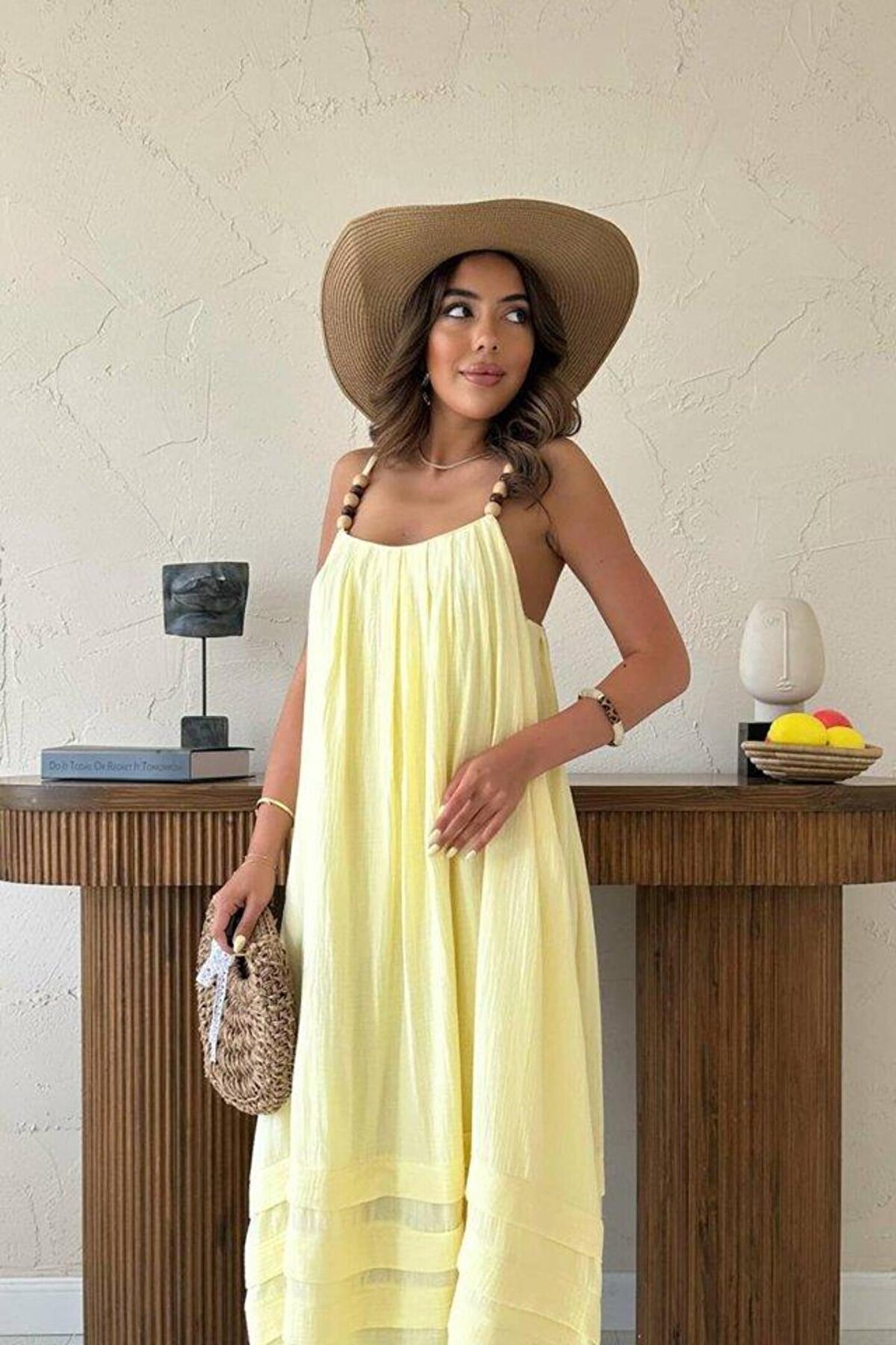 Sarı Askılı Müslin Elbise