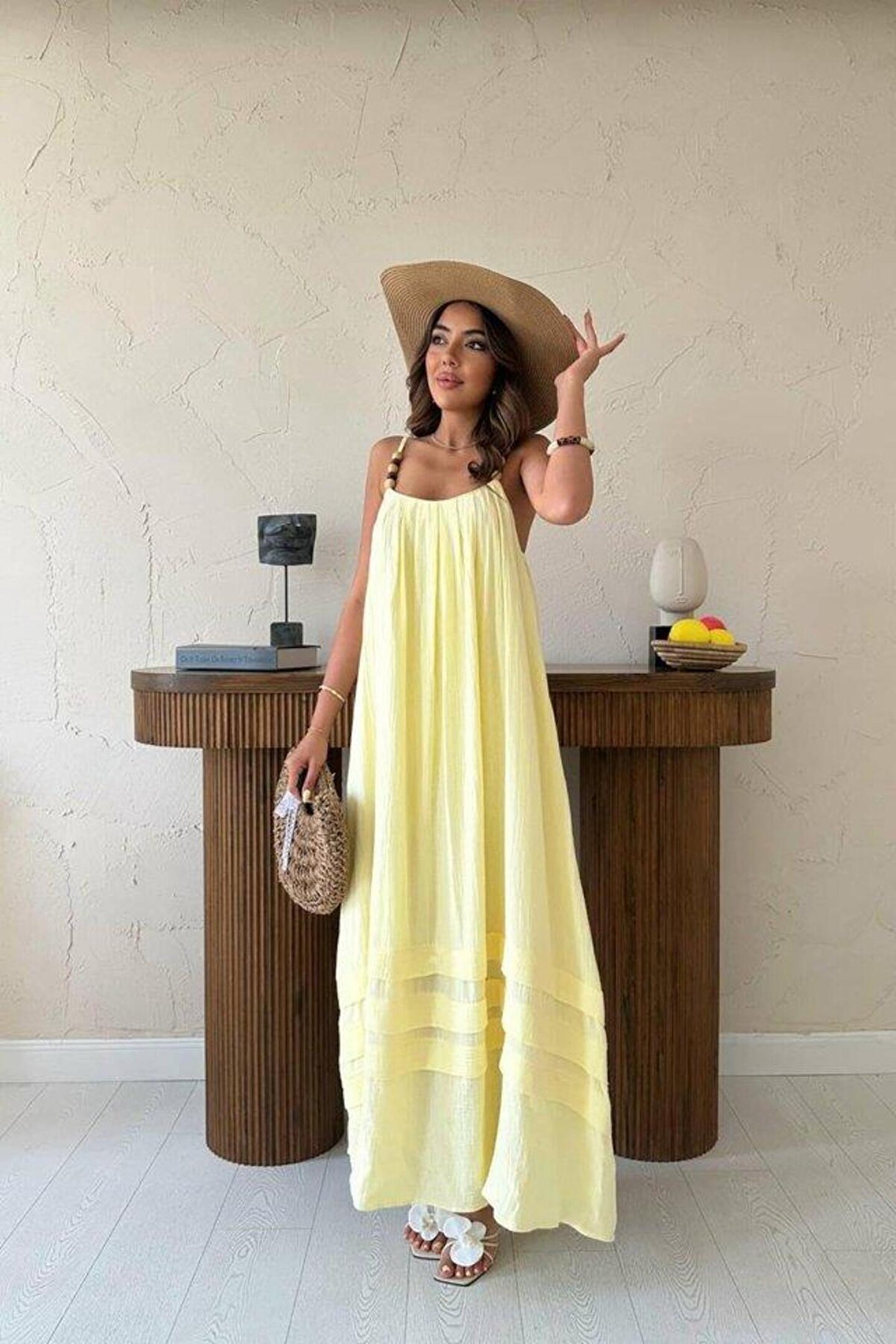 SGM BUTİK Sarı Askılı Müslin Elbise