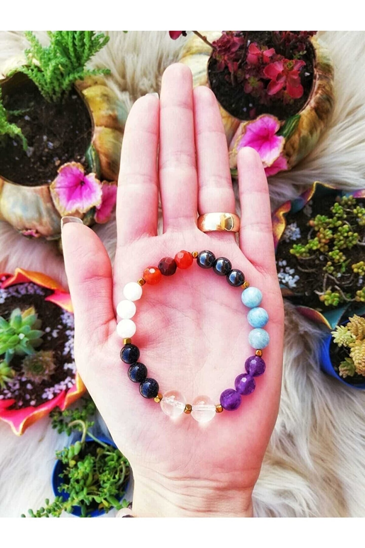 Doğal taş bileklik, Balık burcu için özel olarak tasarlanmış şık ve zarif bir aksesuar seçeneğidir; Ametist, akik, aytaşı, kristal kuvars, akuamarin, yıldız taşı ve hematit gibi farklı doğa taşlarından oluşan bu bileklik, her bir taşıyla benzersiz bir enerji ve estetik sunar; Doğal taş materyali sayesinde her bileklik, doğanın saf güzelliğini ve gücünü parmaklarınıza taşır; Bu bileklik, hem günlük kullanım hem de özel günler için ideal bir aksesuar olarak öne çıkar;