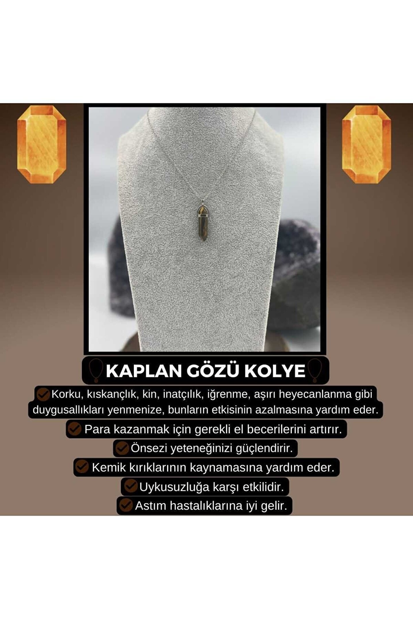 Cesareti artırır, korkularımızı yenmemize yardımcı olur. ; Sahiplenme duygusunu güçlendirir. ; Enerjiyi dengeler. ; Psikolojik zorlanmaları yenmemize yardım eder. ; Önsezi yeteneğimizi güçlendirir. ; İyimserlik verir. ; Gizemli ortamlarda koruyucudur. ; Para kazanmak için gerekli el becerilerini artırır. ; Korku, kıskançlık, kin, inatçılık, iğrenme, aşırı heyecanlanma gibi duygusallıkları yenmemize, bunların etkisinin azalmasına yardım eder. ; Kanı temizler, kalp için yararlıdır. ; Sinirsel spazmları ve baş ağrısını hafifletir, hatta ortadan kaldırır. ; Doğum sancısını ve diğer ağrıları hafifletir. ; Eklem yangısına iyi gelir. ; Kemik kırıklarının kaynamasına yardım eder. ; Dalak ve pankreasın çalışmasını güçlendirir. ; İNSOMNİA için çaredir. ; Uyuyamayanlara uyku verir. ; Kâbuslar gören çocuklar için faydalıdır. ; Enerjileri dengeler. ; Ticaret hayatımızda başarı olmamızı sağlar. ; Korku, kıskançlık, kin, inatçılık gibi duygularımızı yenmemizi sağlar. ;