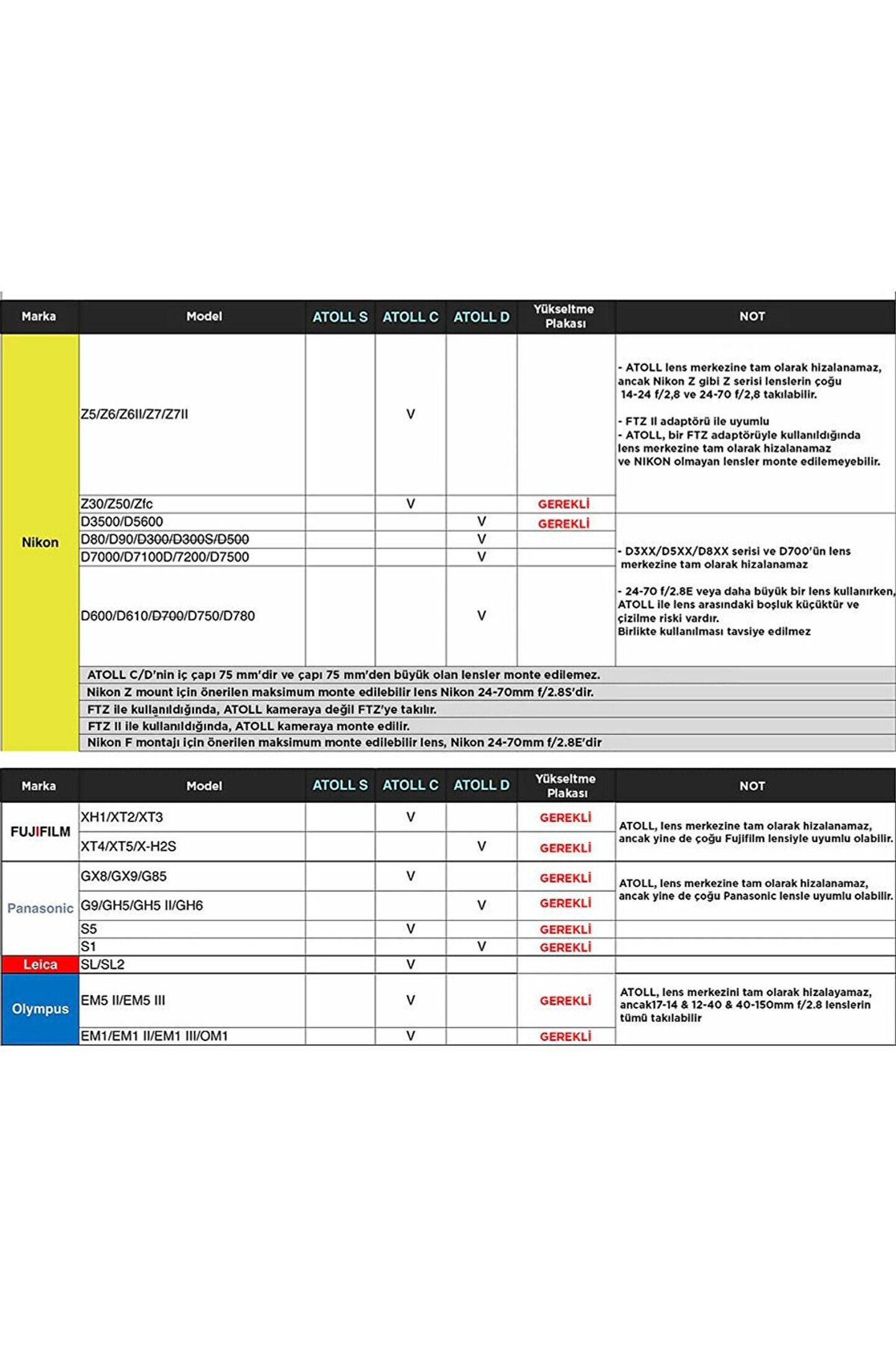 · ATOLL, genel DSLR ve aynasız fotoğraf makineleri için uygundur, Aşağıdaki fotoğraf makineleri ATOLL ile uyumlu değildi