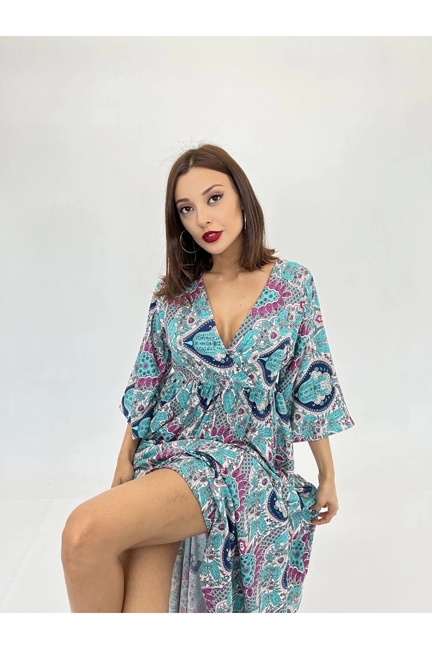 Kalın Askılı Kare Yaka Baskılı Keten Mavi Midi Boy Elbise