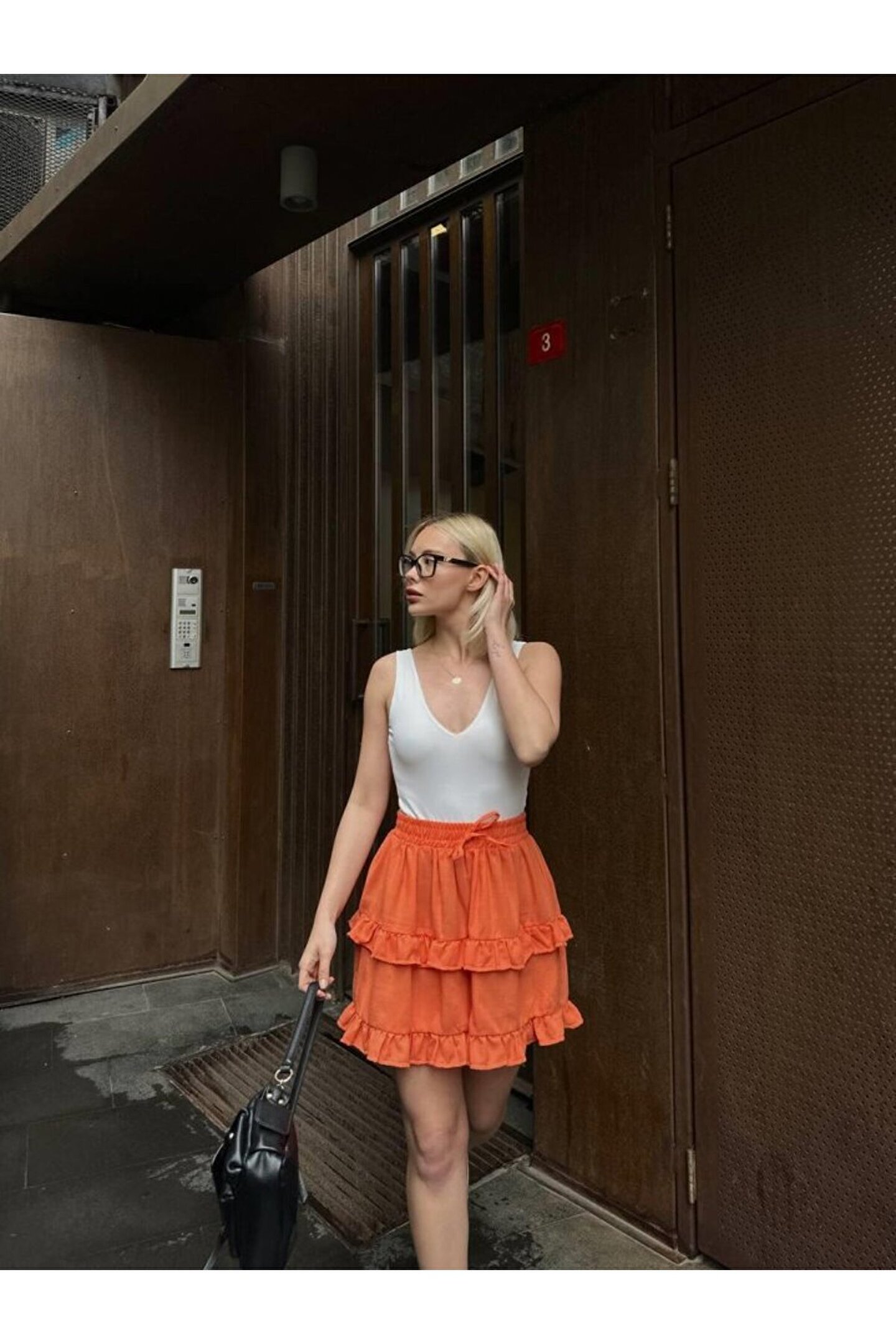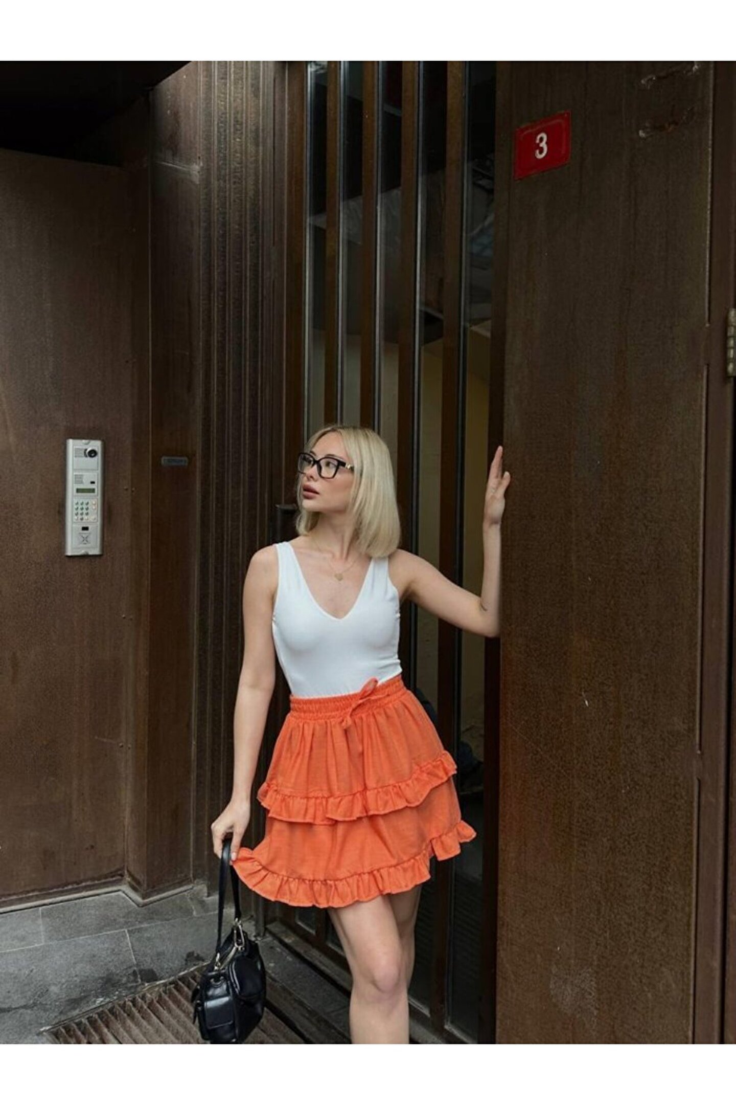 BEL LASTİKLİ KAT FIRFIR DETAYLI KISA ETEK - TuruncuModelin Ölçüleri: Boy:165, Kg:55, Göğüs:90, Bel:72, Kalça: 100Modelin üzerindeki ürün M/38 bedendir
