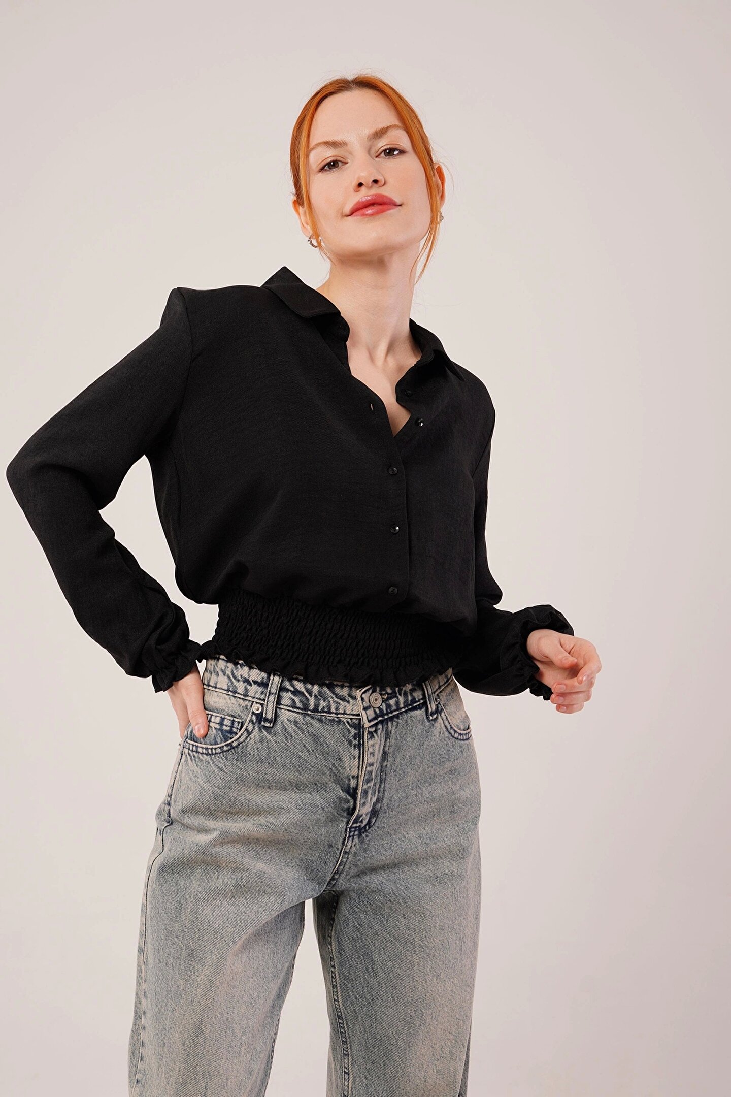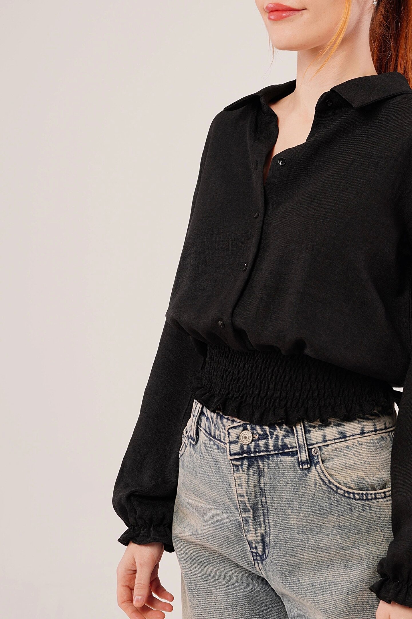 Bel Ve Bilek Lastikli Siyah Bluz