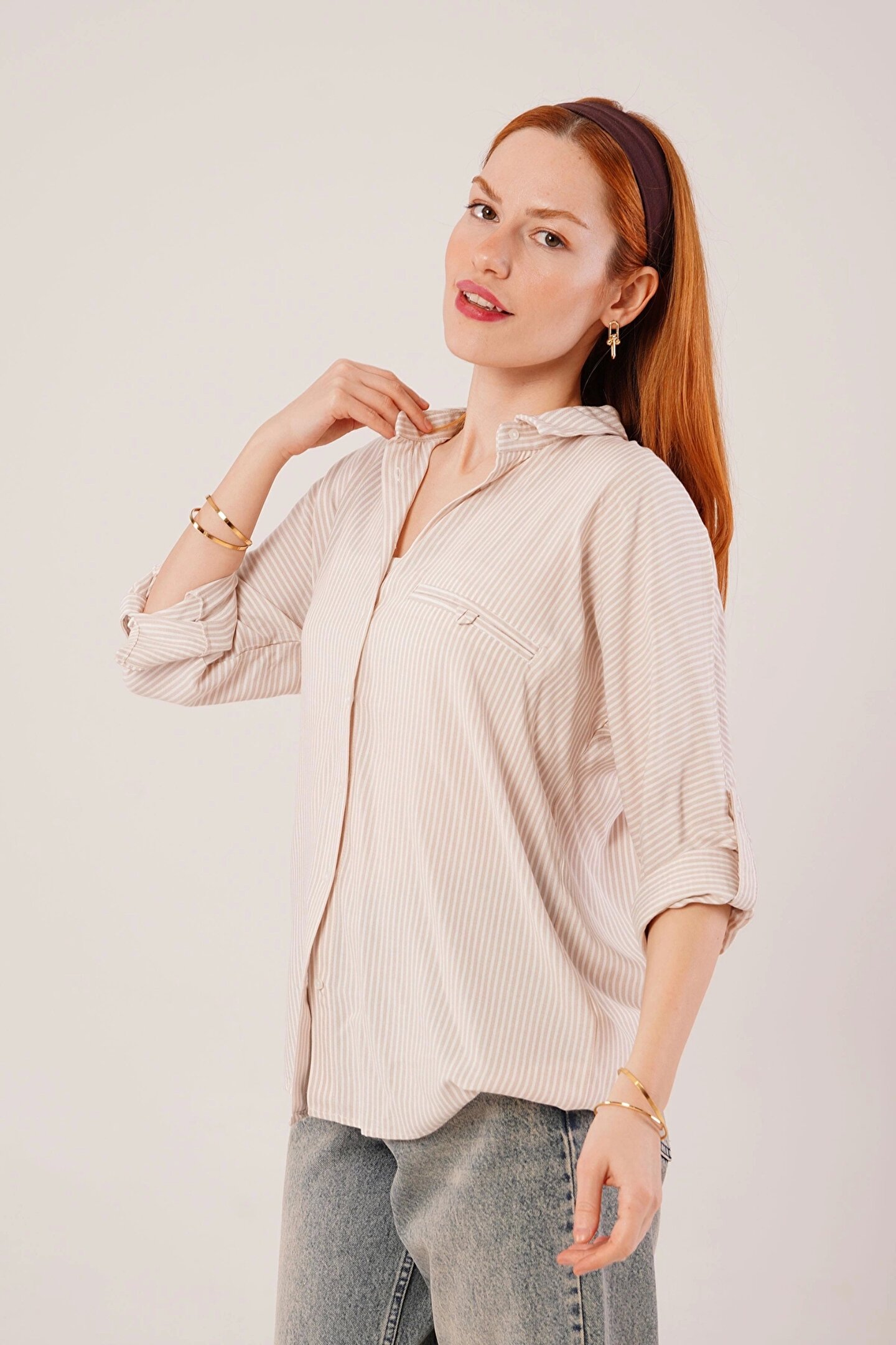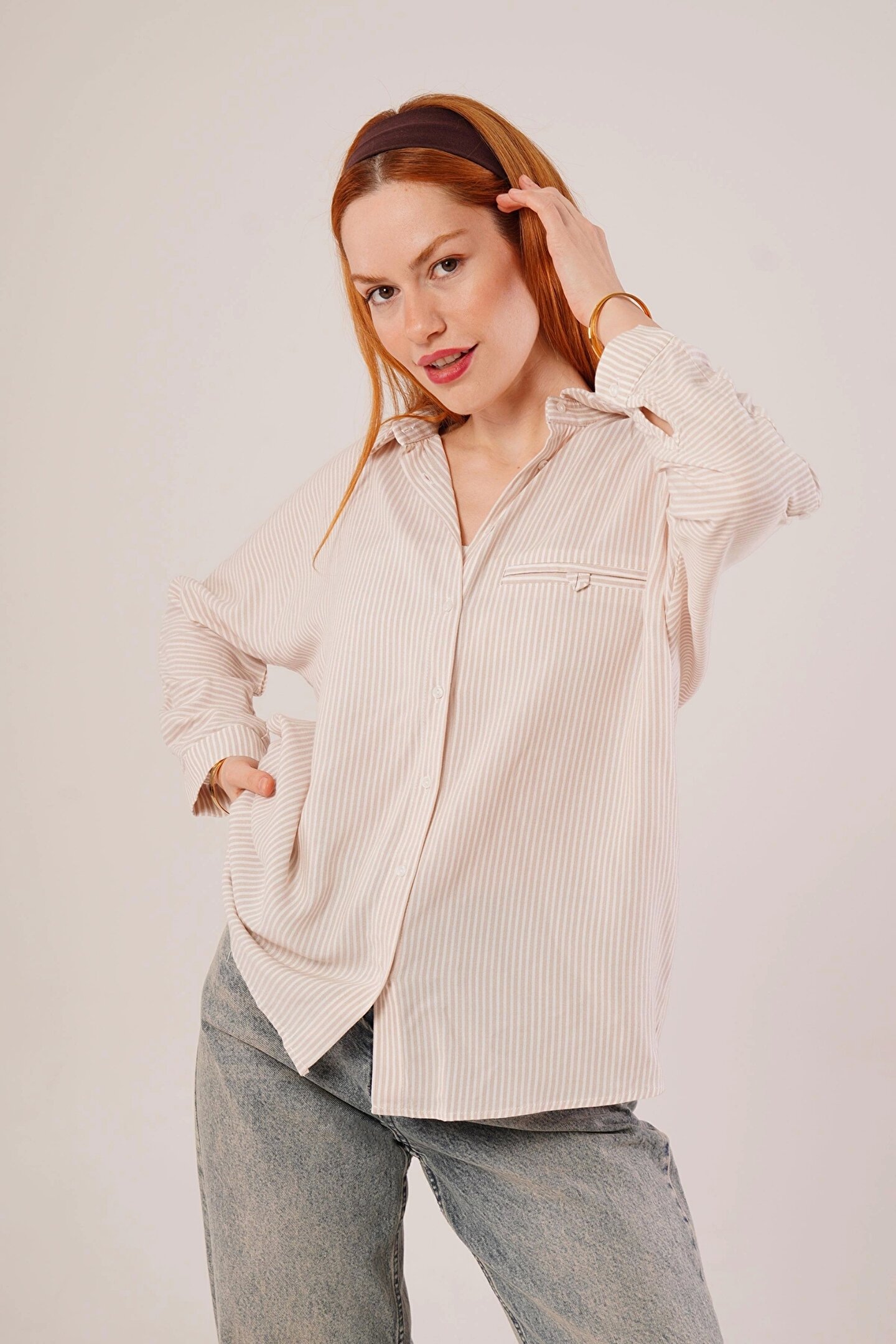 Cep Detay Çizgili Oversize Krem Gömlek