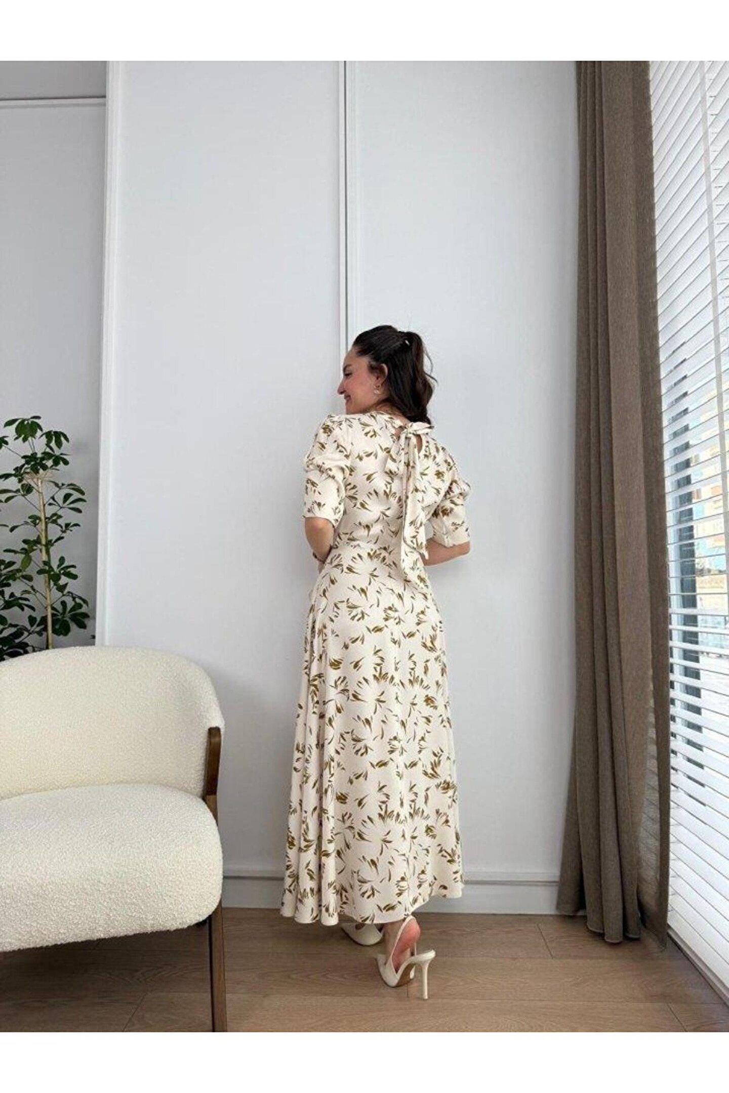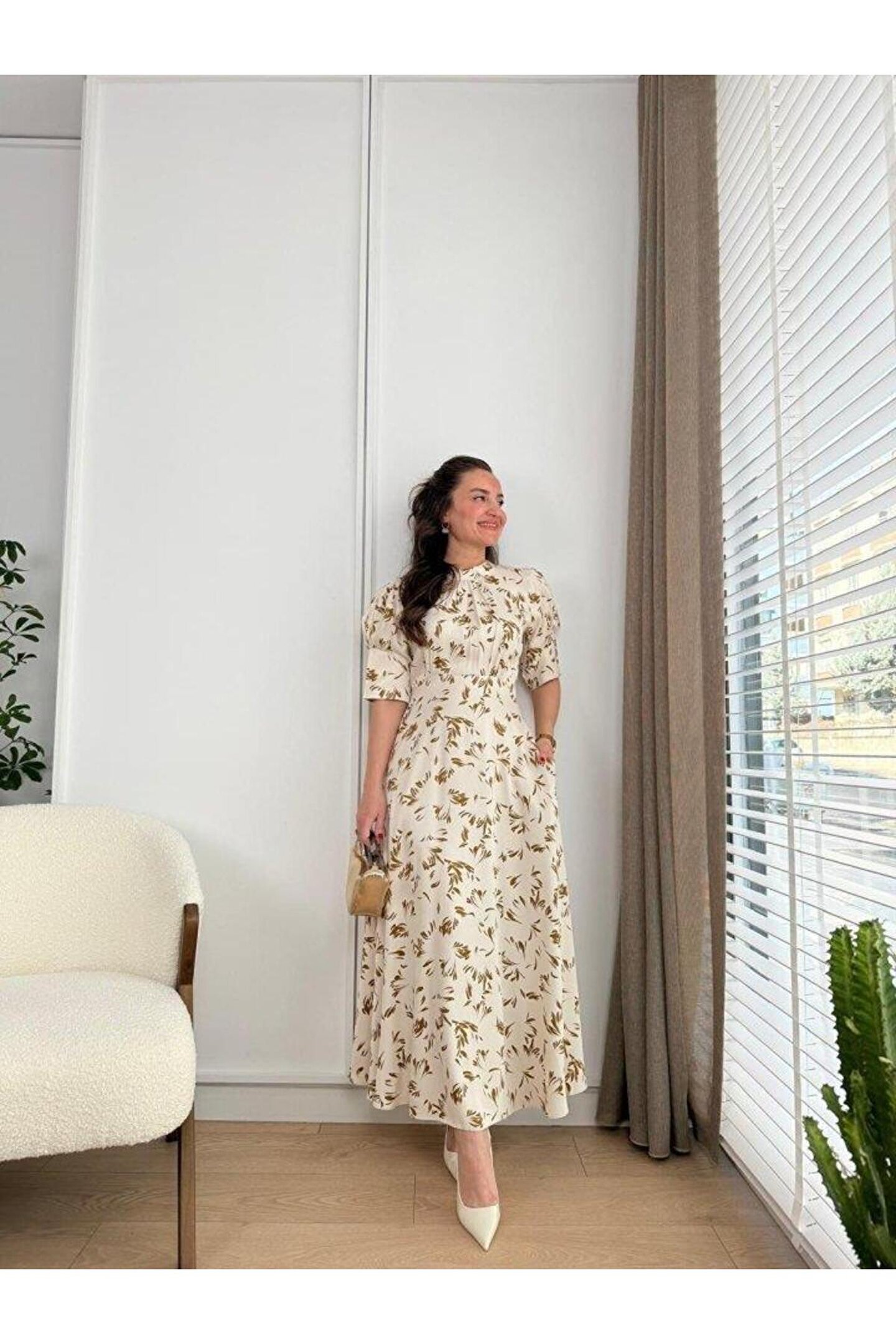 Ekru Yakası Bağlama Detaylı Elbise