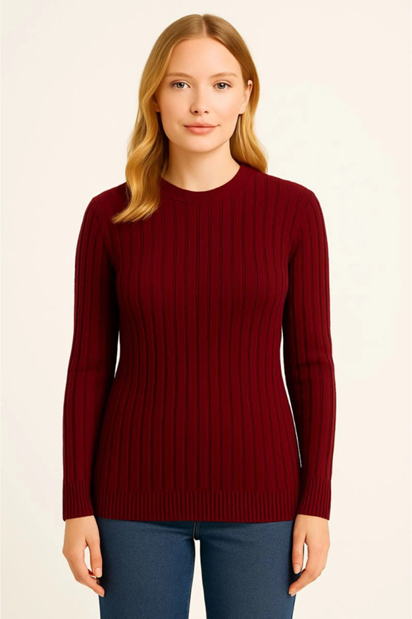 Bisiklet Yuvarlak Yaka Triko Kazak Pamuklu Kalın Fitilli Dokuma, Regular Fit Uzun Kollu Kışlık Model - Bordo