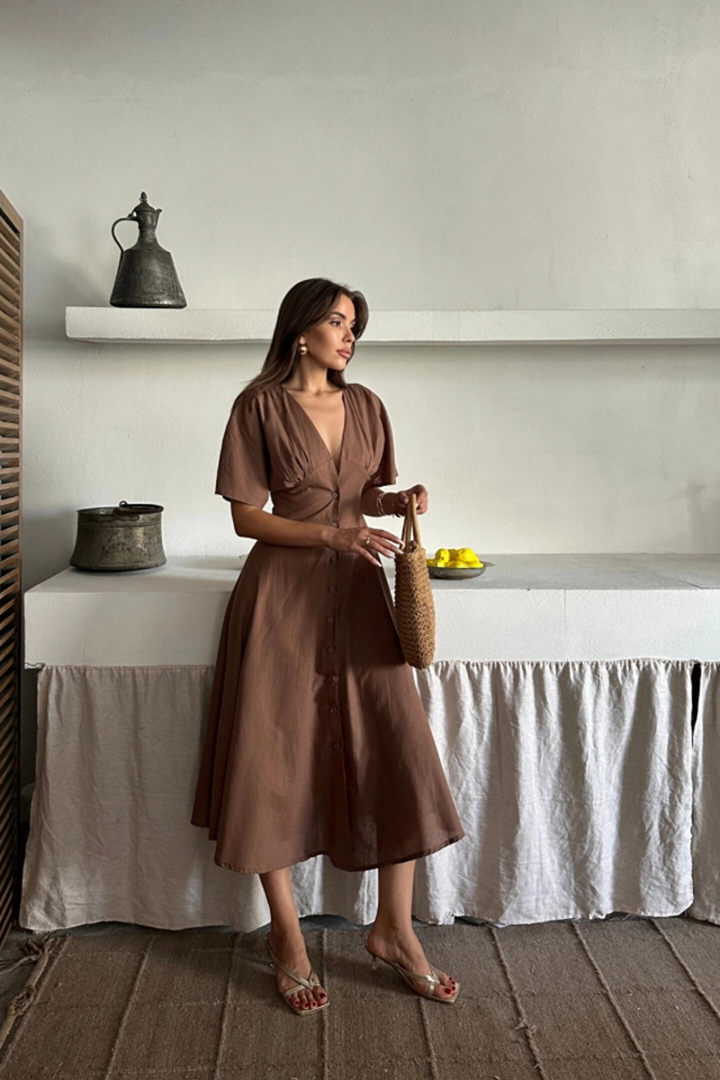 KETEN V YAKA ÖNDEN DÜĞMELİ ELBİSE - Kahverengi
