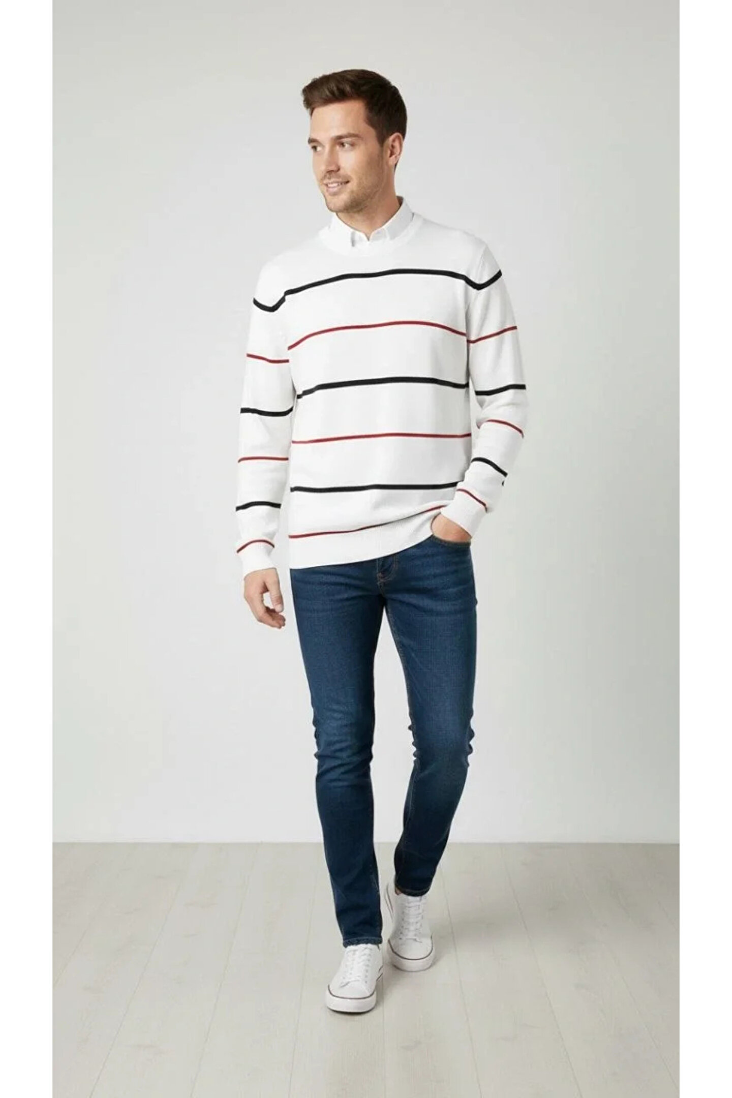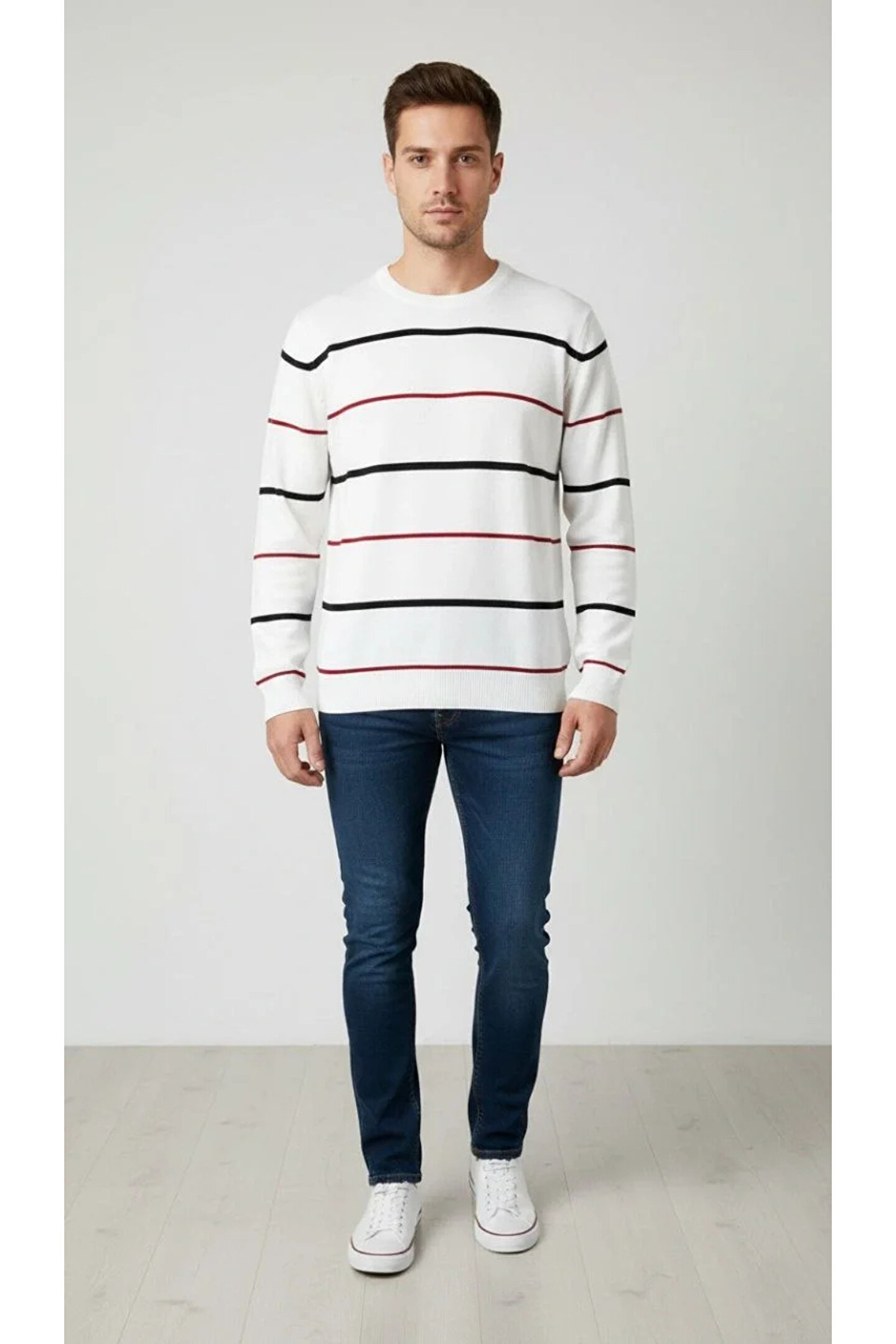 Silerra Erkek Bisiklet Yaka Cizgili Triko Kazak yumuşak dokulu Pamuklu ince Dokuma, uzun kollu Rahat Regular