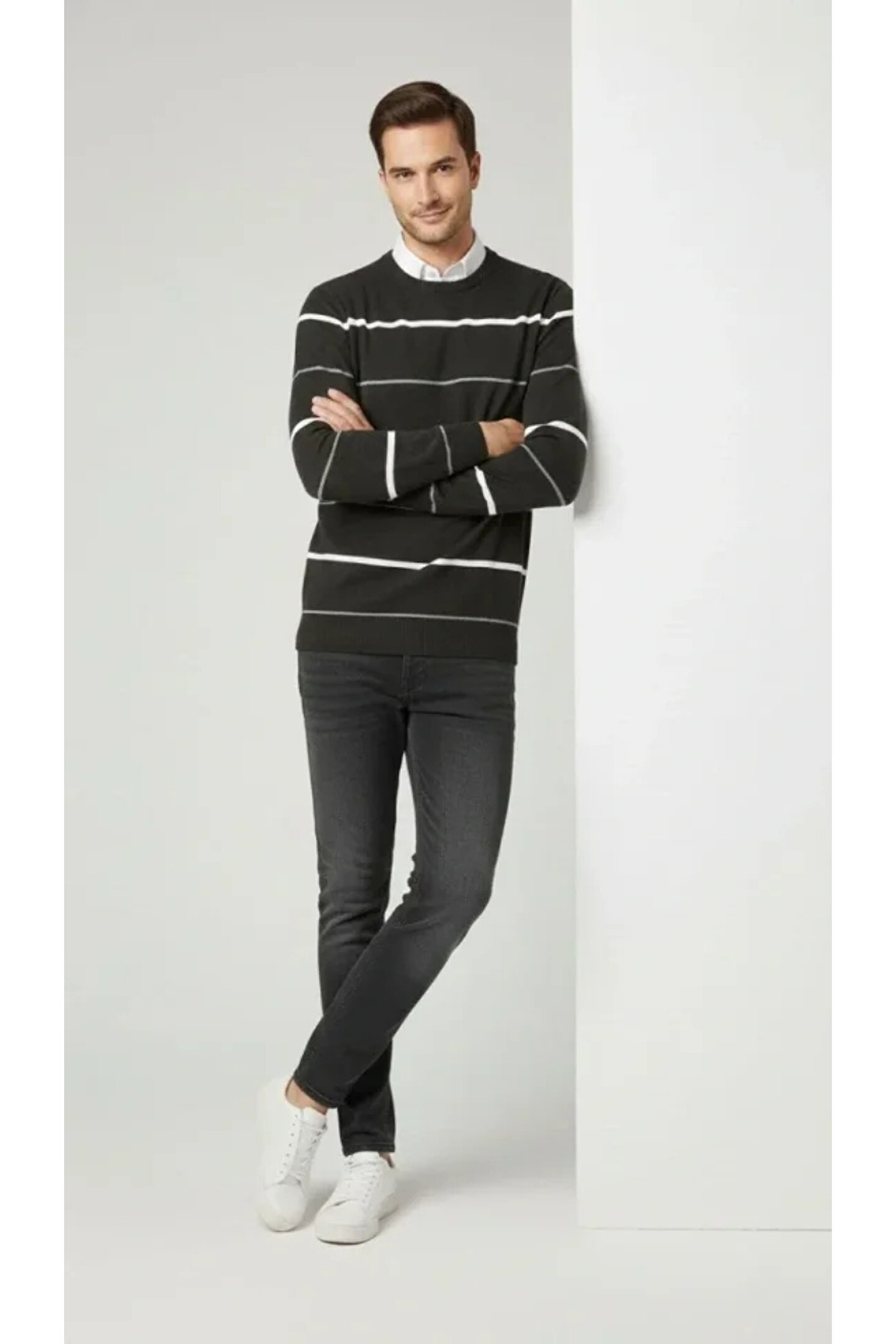 Erkek Bisiklet Yaka Cizgili Triko Kazak Yumuşak Dokulu Pamuklu Ince Dokuma, Uzun Kollu Rahat Regular Kalıp - Füme