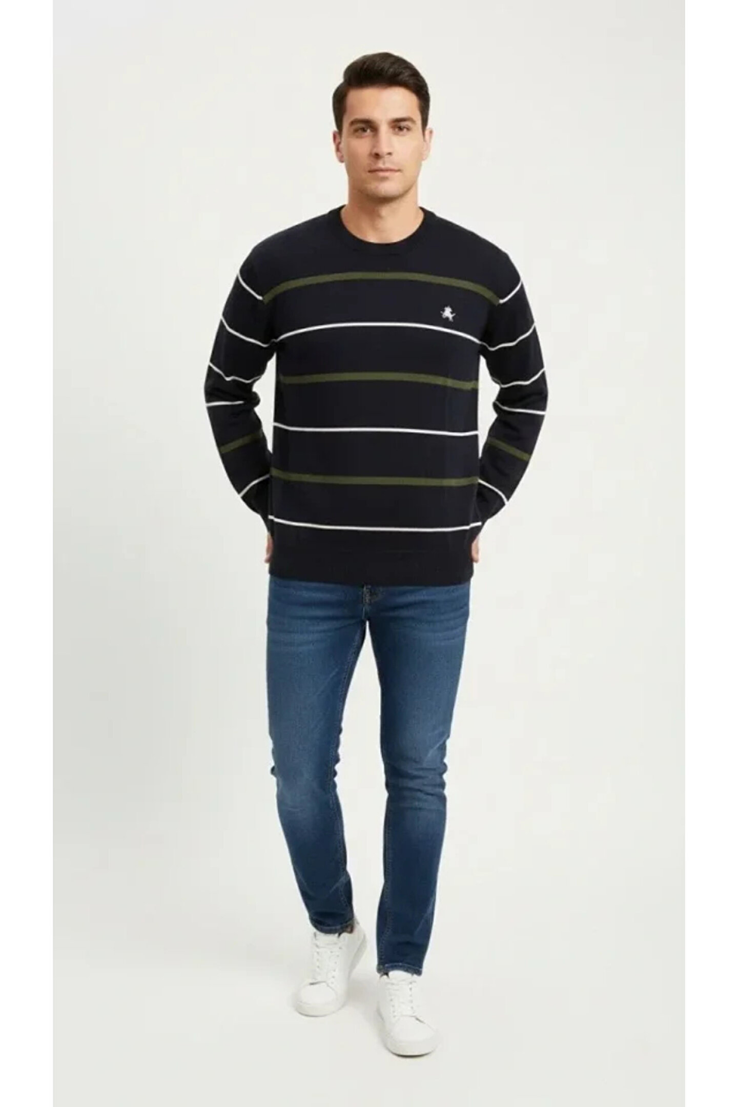 Erkek Bisiklet Yaka Cizgili Triko Kazak Yumuşak Dokulu Pamuklu Ince Dokuma, Uzun Kollu Rahat Regular Kalıp - Lacivert