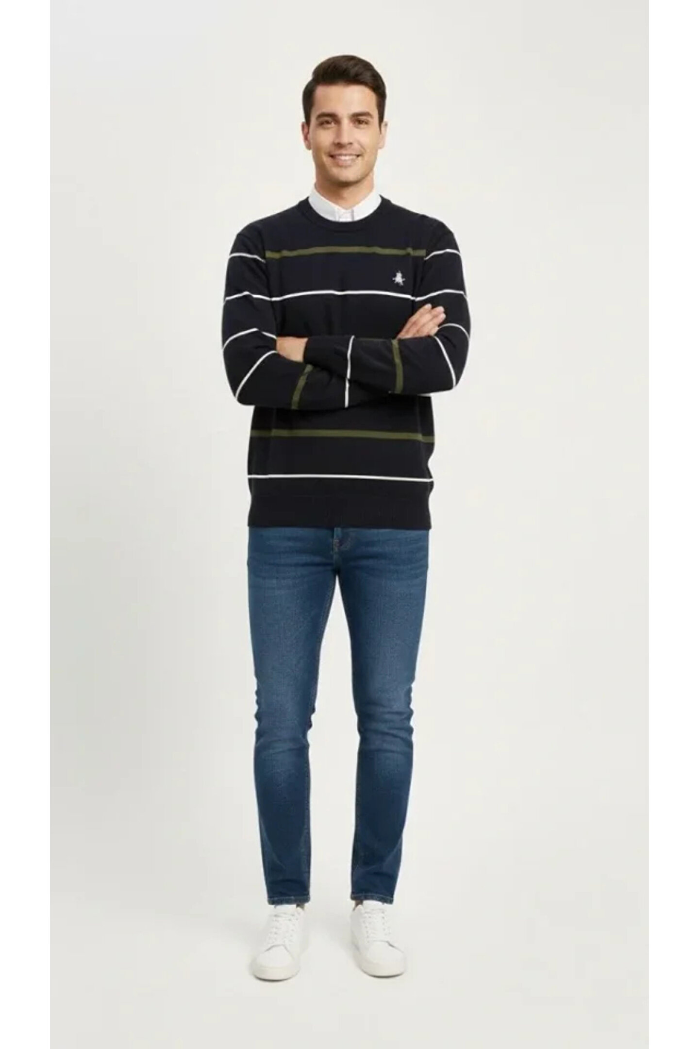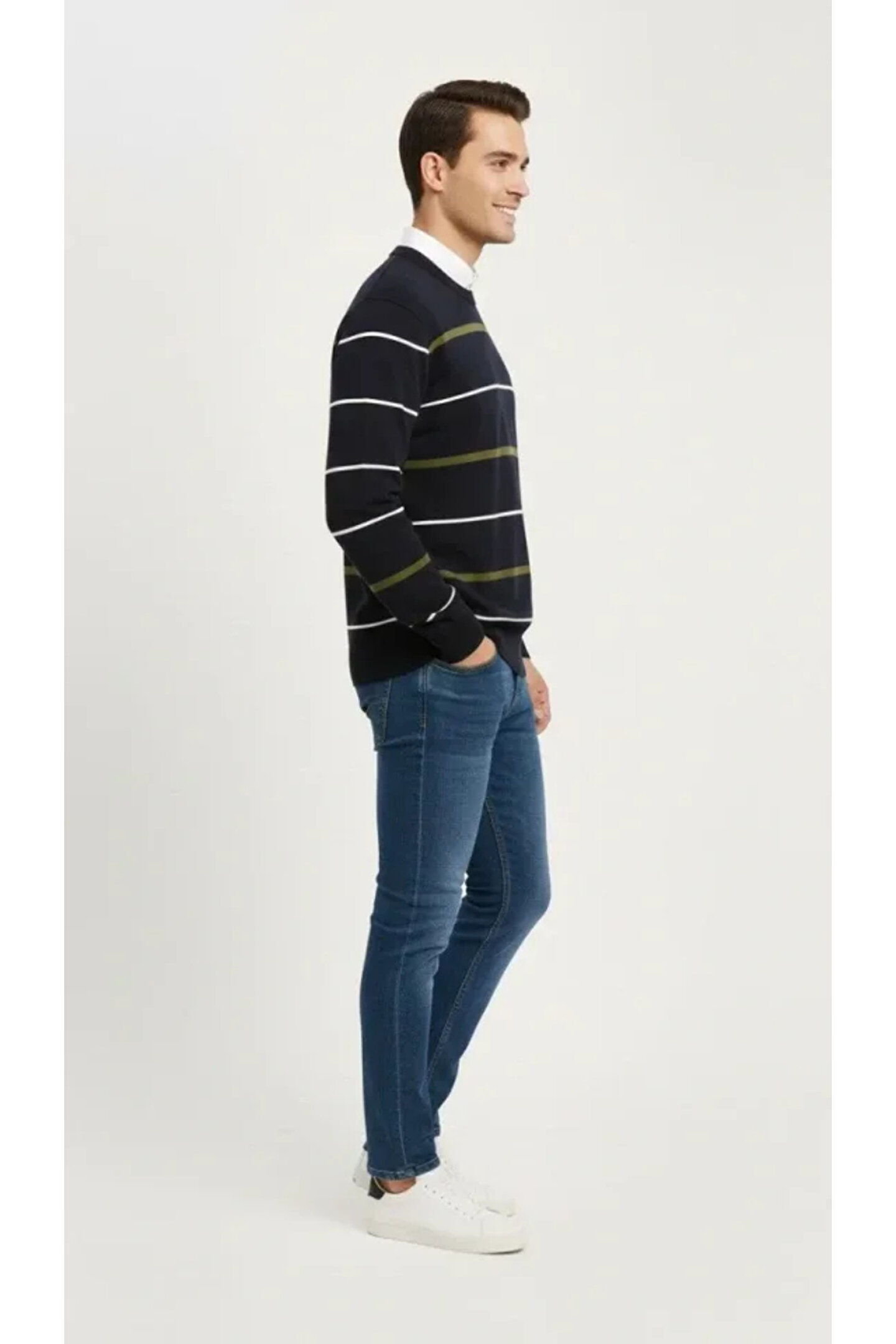 Erkek Bisiklet Yaka Cizgili Triko Kazak Yumuşak Dokulu Pamuklu Ince Dokuma, Uzun Kollu Rahat Regular Kalıp - Lacivert