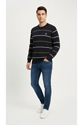Erkek Bisiklet Yaka Cizgili Triko Kazak Yumuşak Dokulu Pamuklu Ince Dokuma, Uzun Kollu Rahat Regular Kalıp - Lacivert