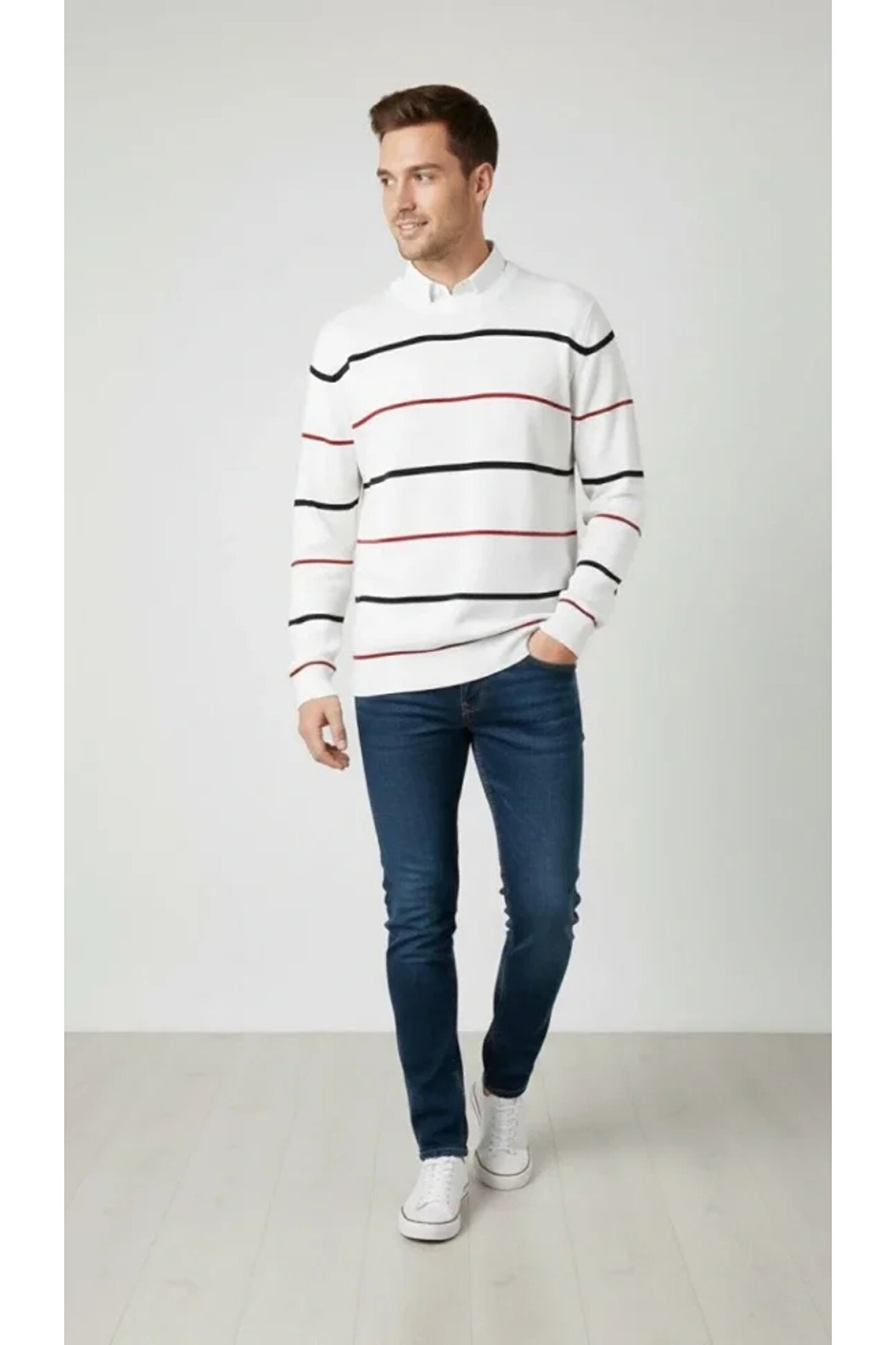Erkek Bisiklet Yaka Cizgili Triko Kazak Yumuşak Dokulu Pamuklu Ince Dokuma, Uzun Kollu Rahat Regular Kalıp - Beyaz