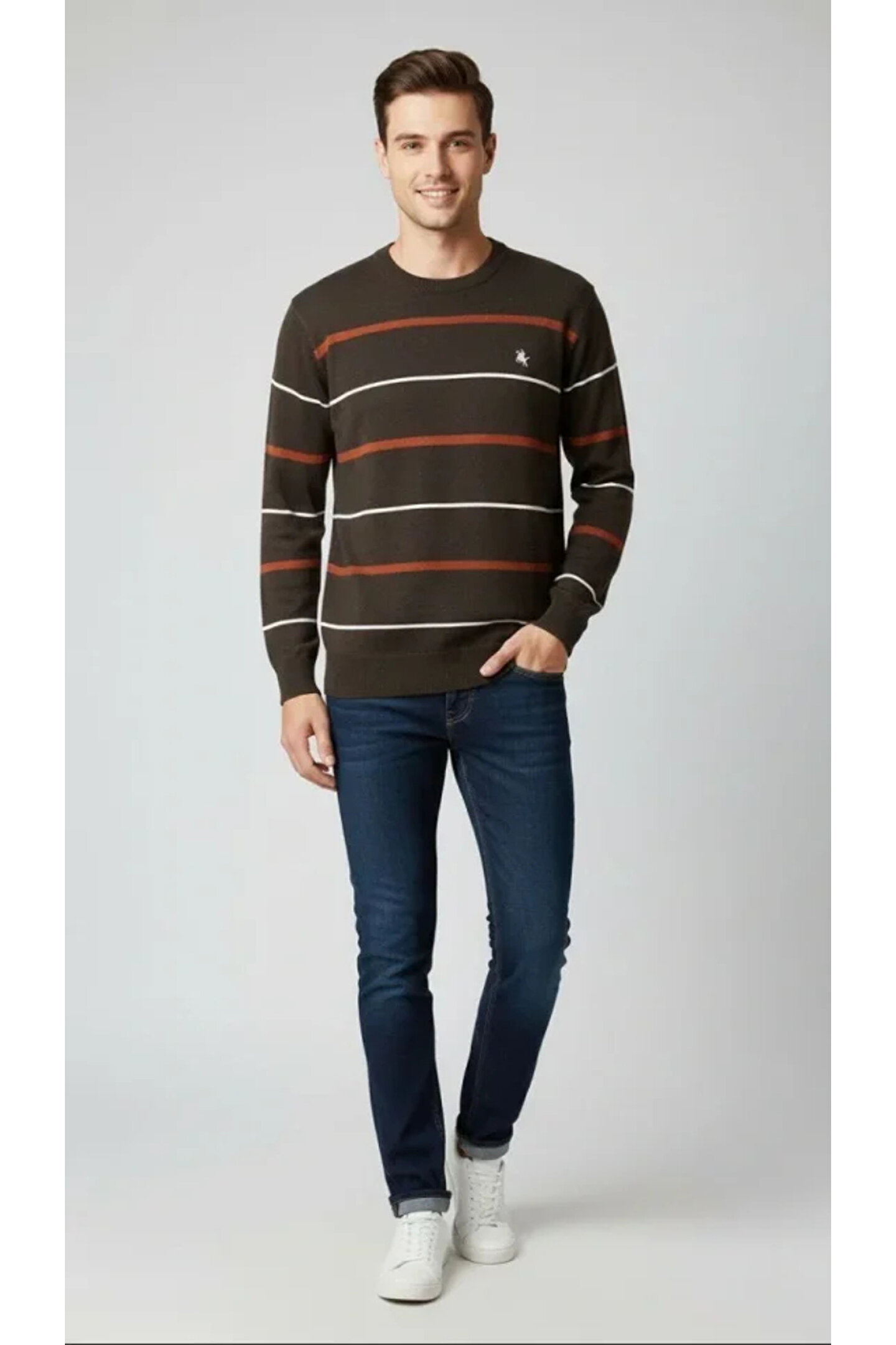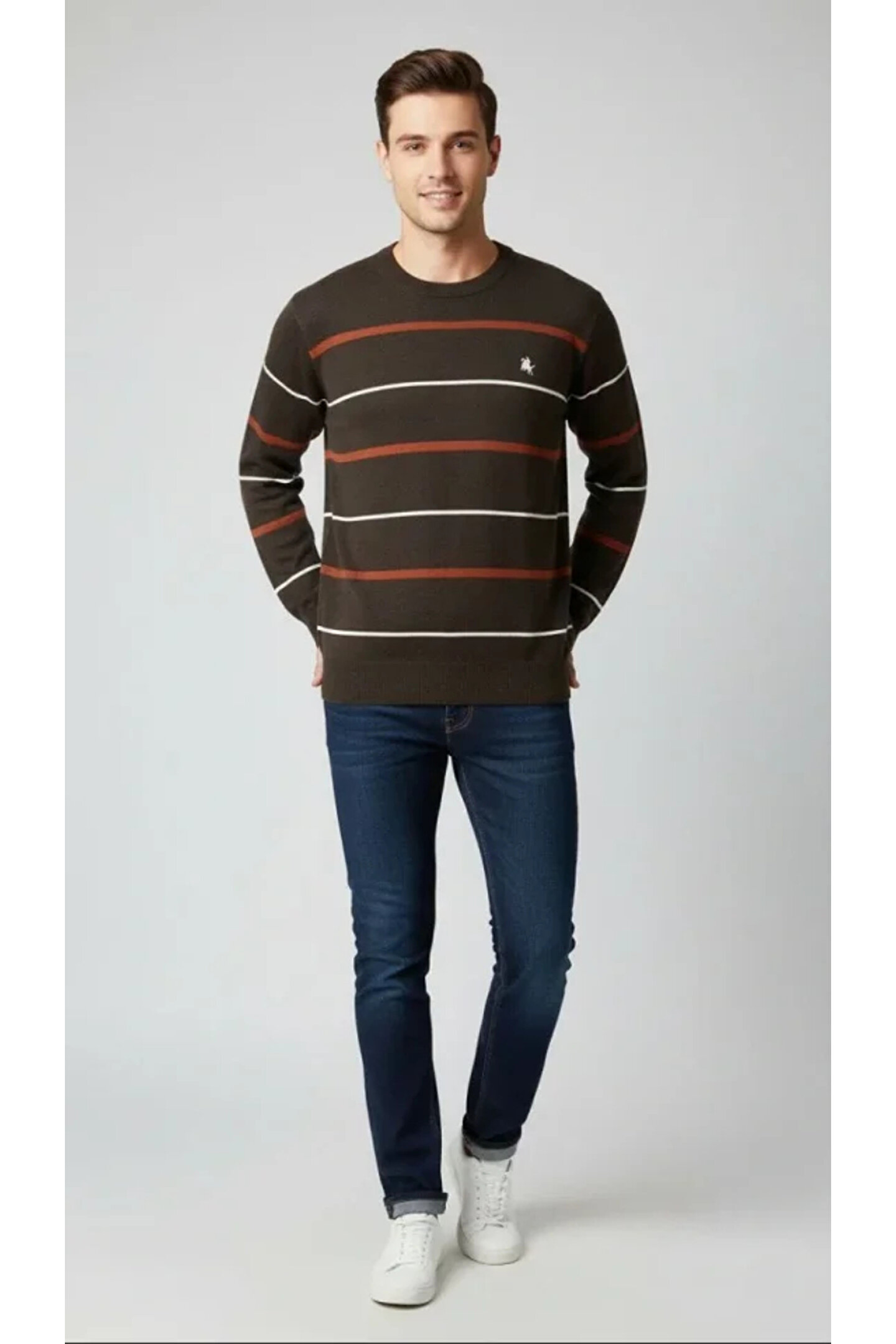 Erkek Bisiklet Yaka Cizgili Triko Kazak Yumuşak Dokulu Pamuklu Ince Dokuma, Uzun Kollu Rahat Regular Kalıp - Koyu Kahverengi