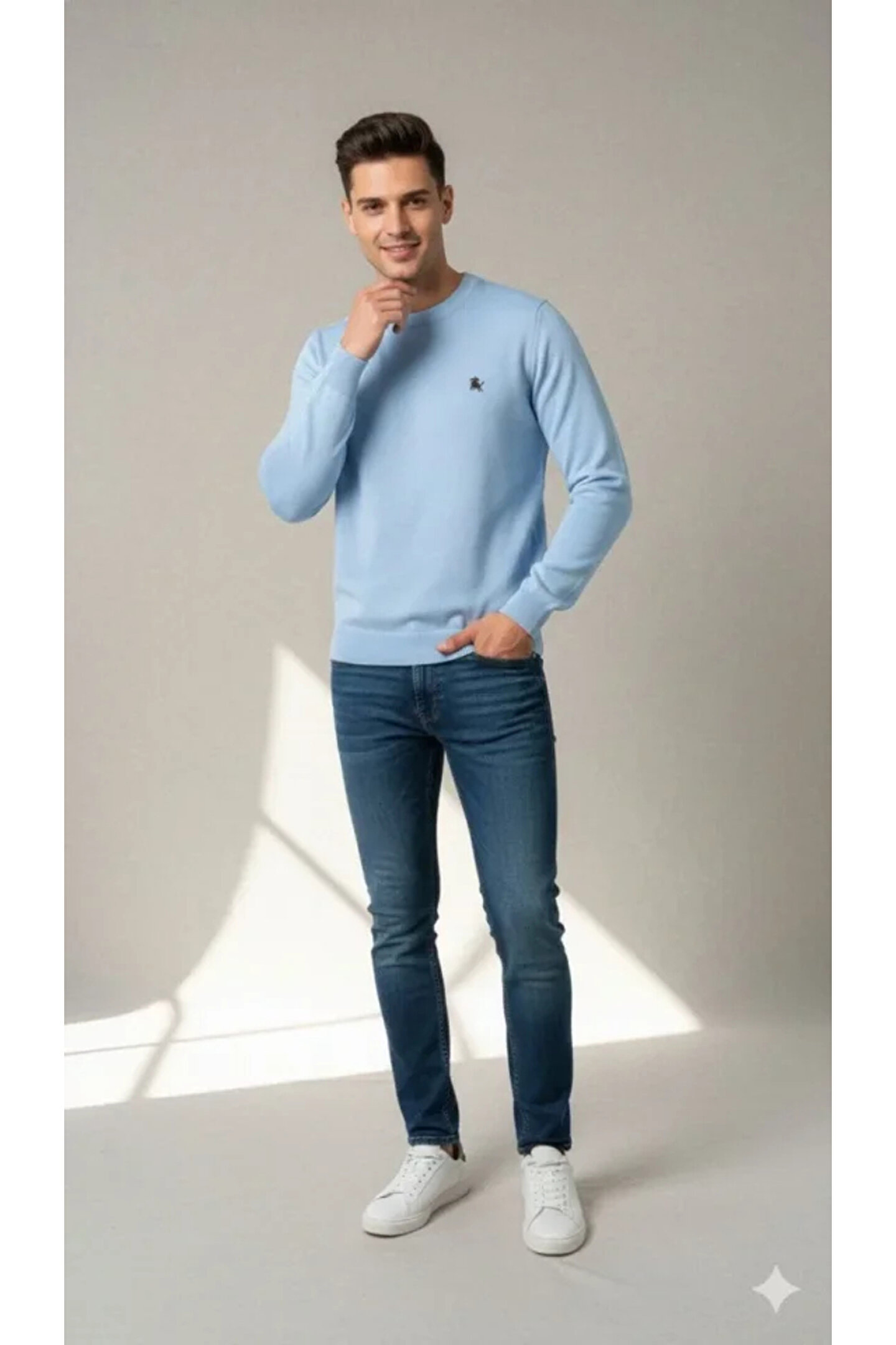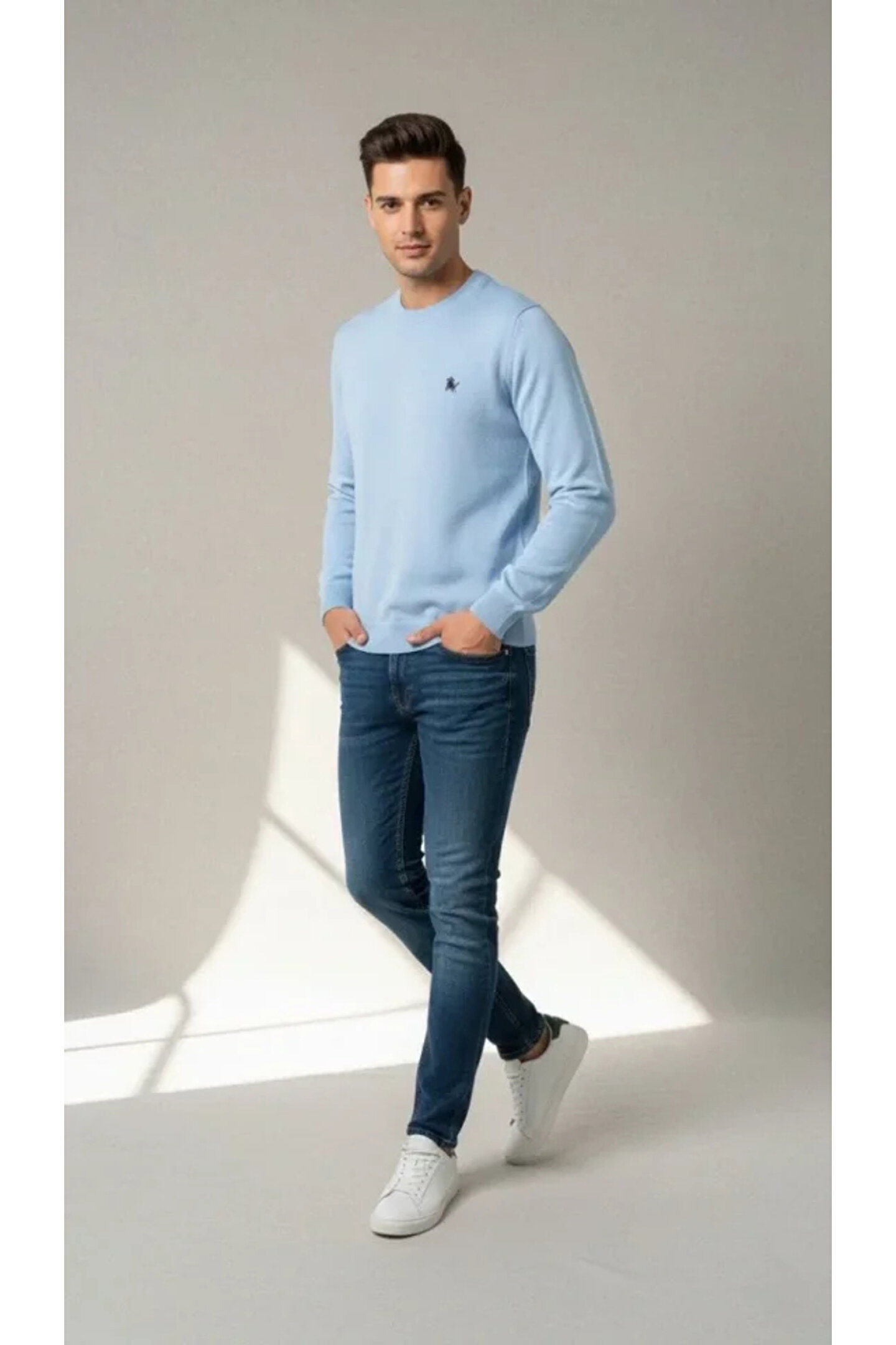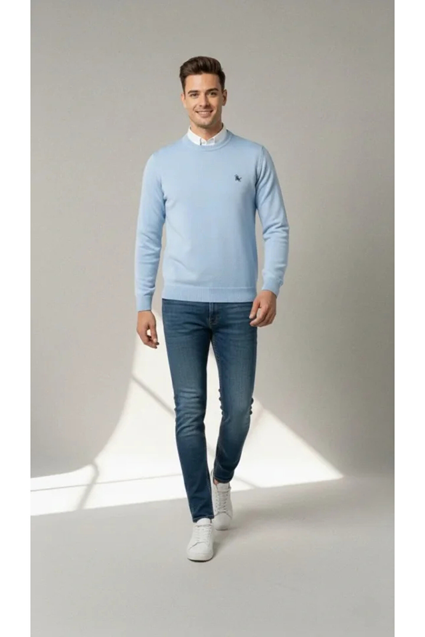 Erkek Bisiklet Yaka Nakış Işlemeli Triko Kazak Yumuşak Dokulu Pamuklu Ince Dokuma, Uzun Kollu Rahat Regular Kalıp - Mavi