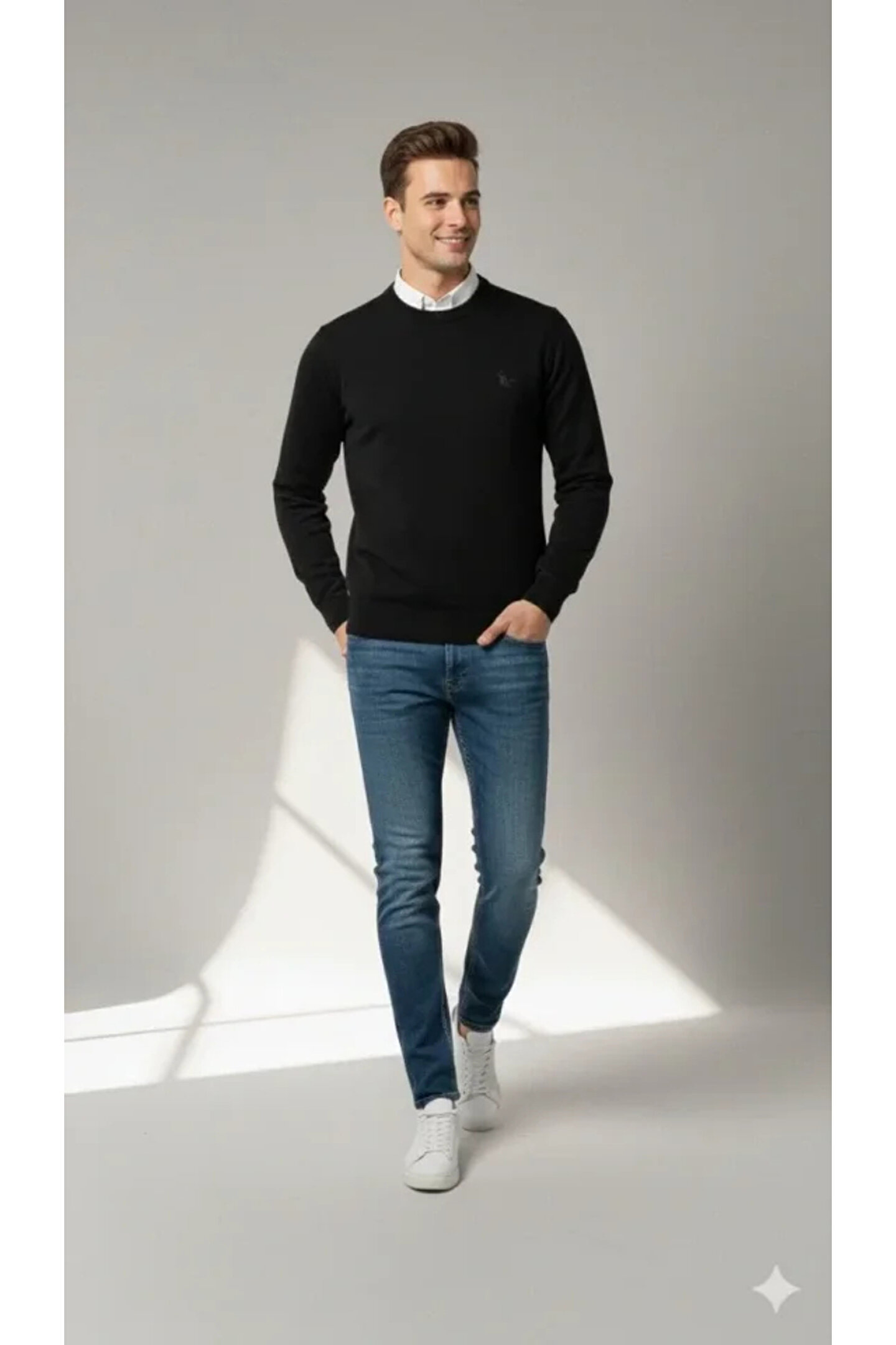 Erkek Bisiklet Yaka Nakış Işlemeli Triko Kazak Yumuşak Dokulu Pamuklu Ince Dokuma, Uzun Kollu Rahat Regular Kalıp - Siyah