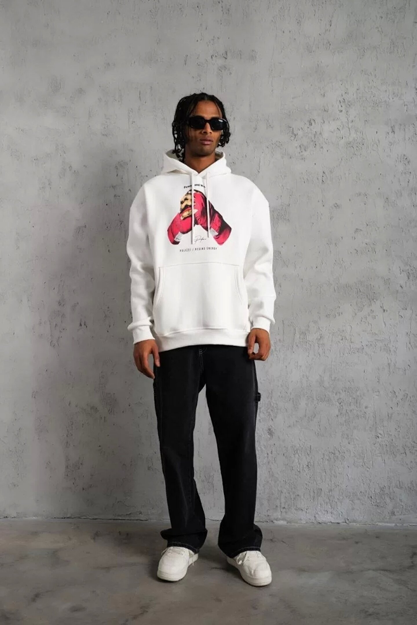 Silerra Erkek Eldiven Baskılı Kapüşonlu Sweat - Beyaz