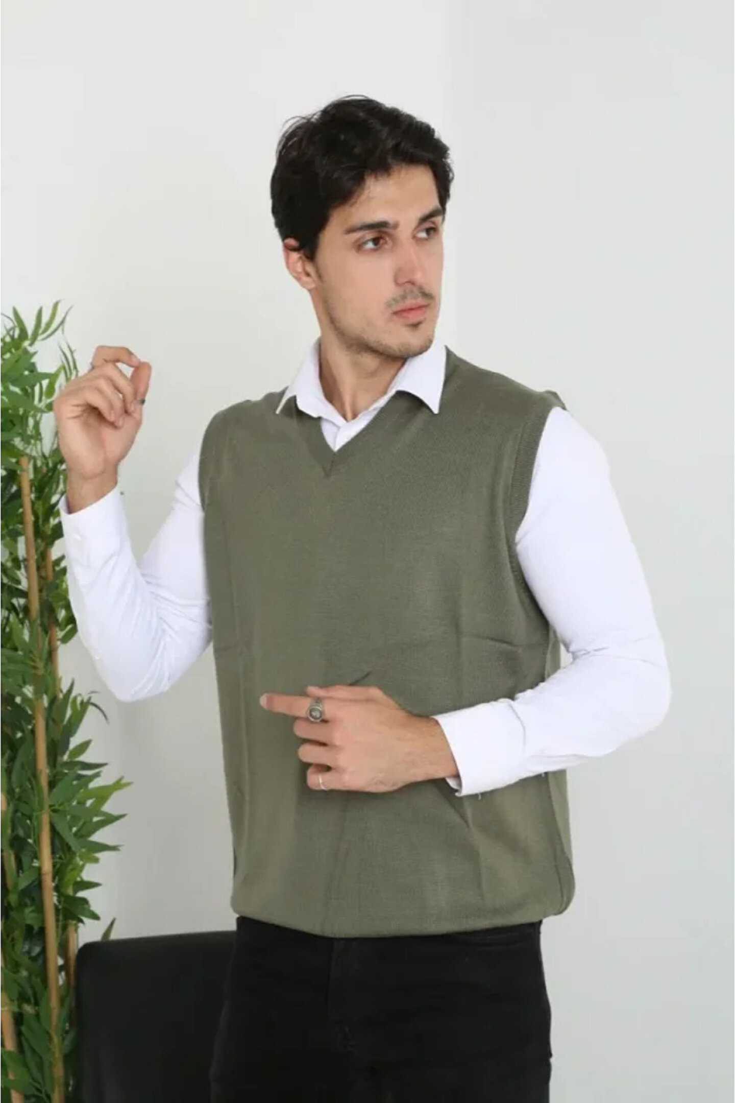 Erkek V Yaka Kolsuz Süveter Triko Kazak Yumuşak Dokulu Pamuklu Ince Dokuma Rahat Regular Kalıp - Haki