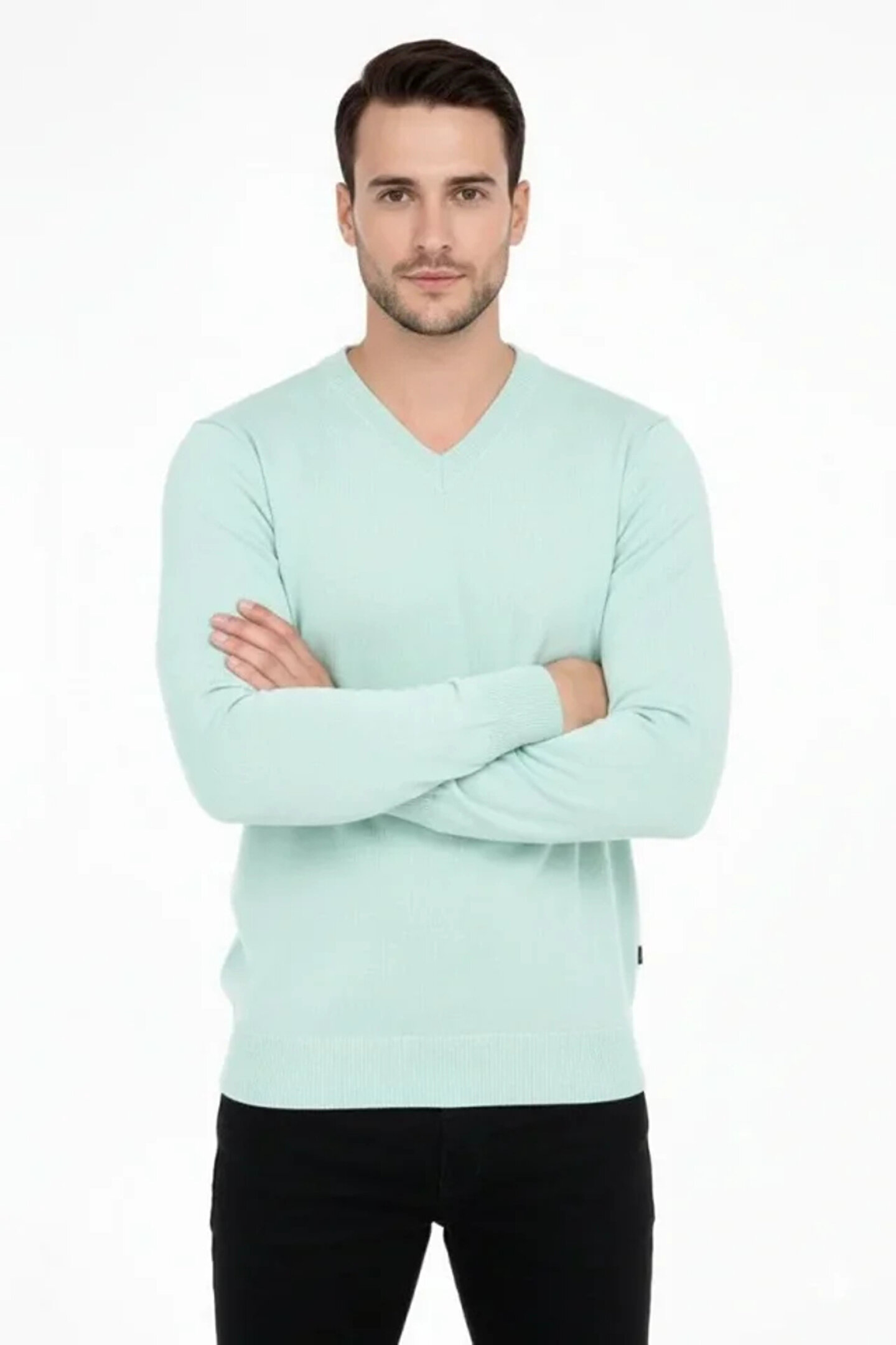 Erkek V Yaka Triko Kazak Yumuşak Dokulu Pamuklu Ince Dokuma, Uzun Kollu Rahat Regular Kalıp - Mint Yeşili