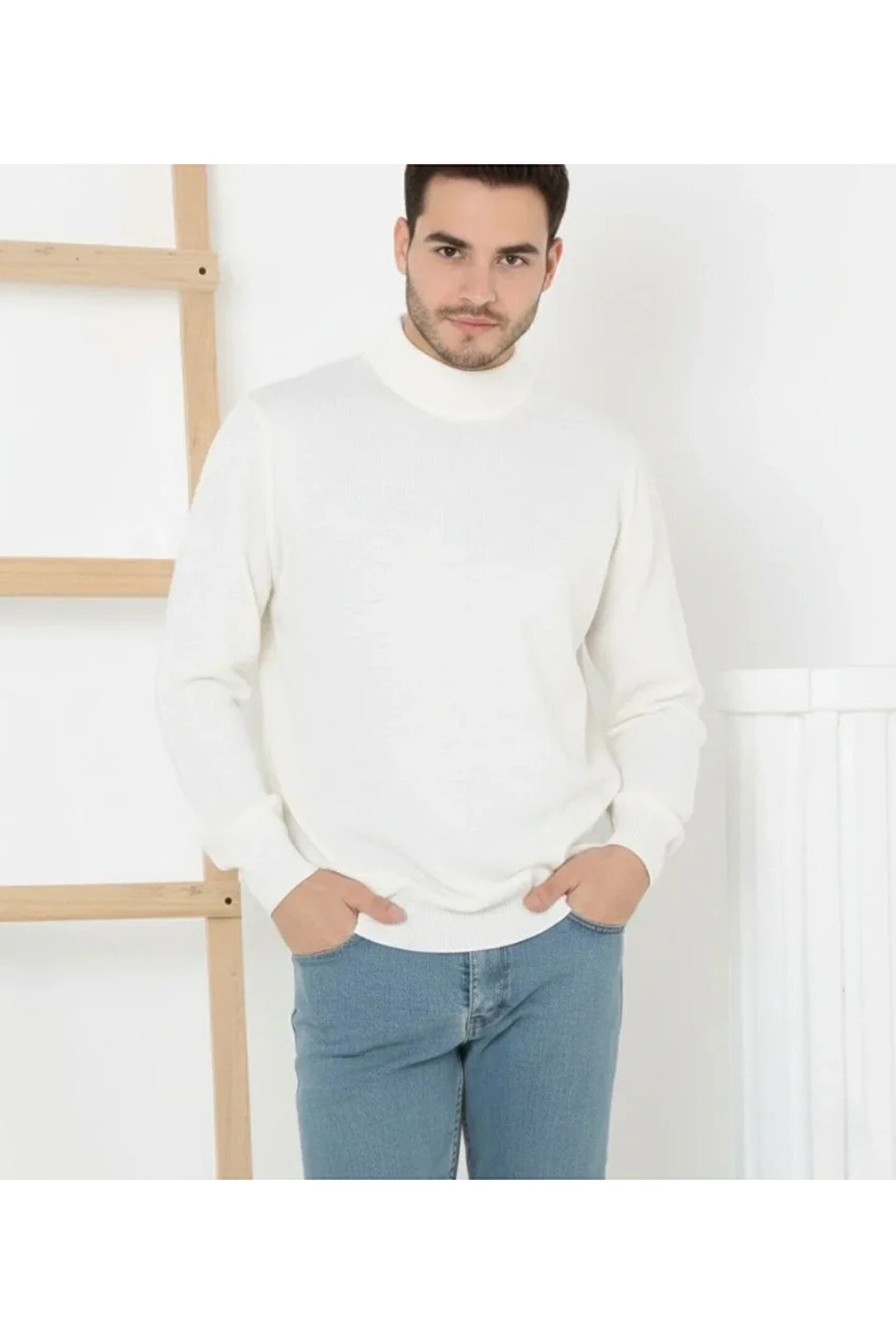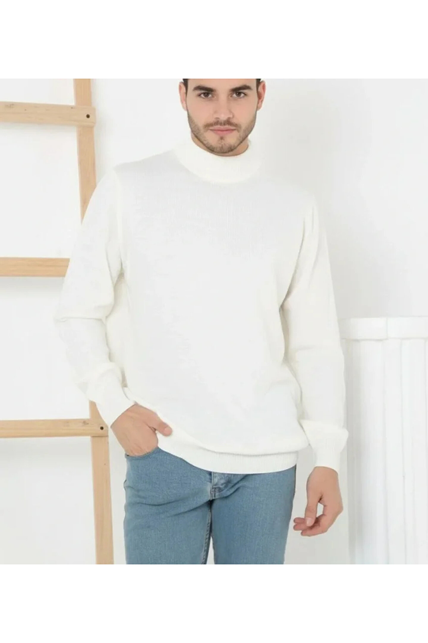 Erkek Yarım Boğaz Triko Kazak Yumuşak Dokulu Pamuklu Ince Dokuma, Uzun Kollu Rahat Regular Kalıp - Beyaz