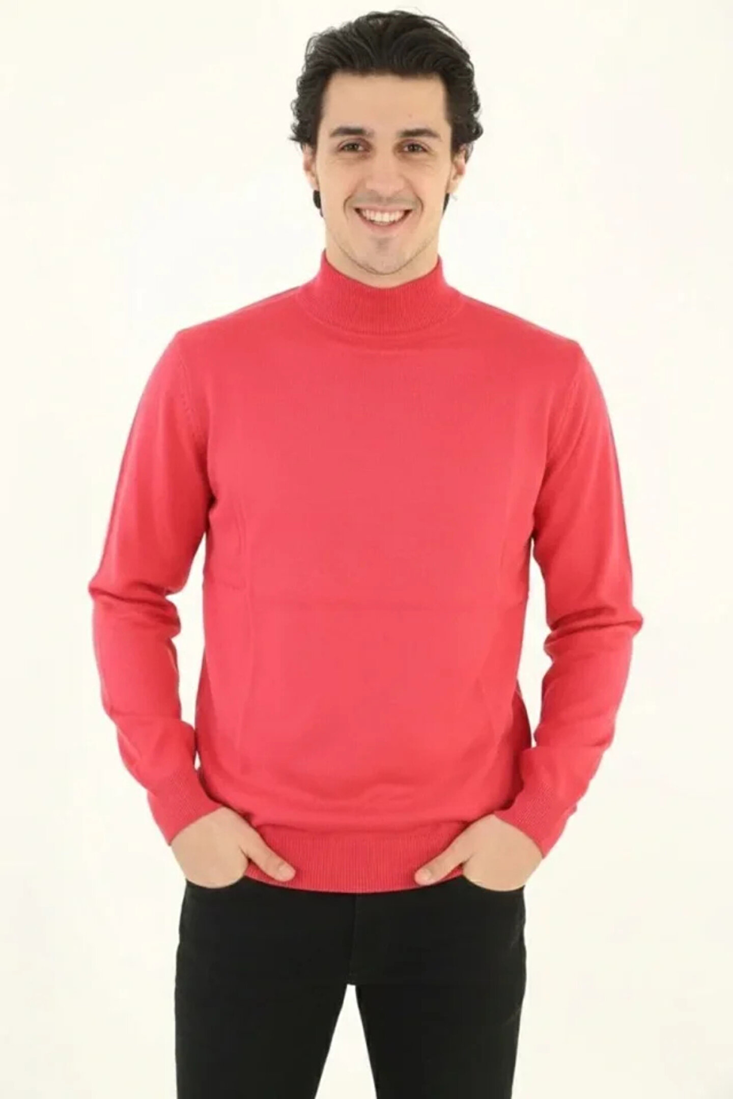 Erkek Yarım Boğaz Triko Kazak Yumuşak Dokulu Pamuklu Ince Dokuma, Uzun Kollu Rahat Regular Kalıp - Pembe
