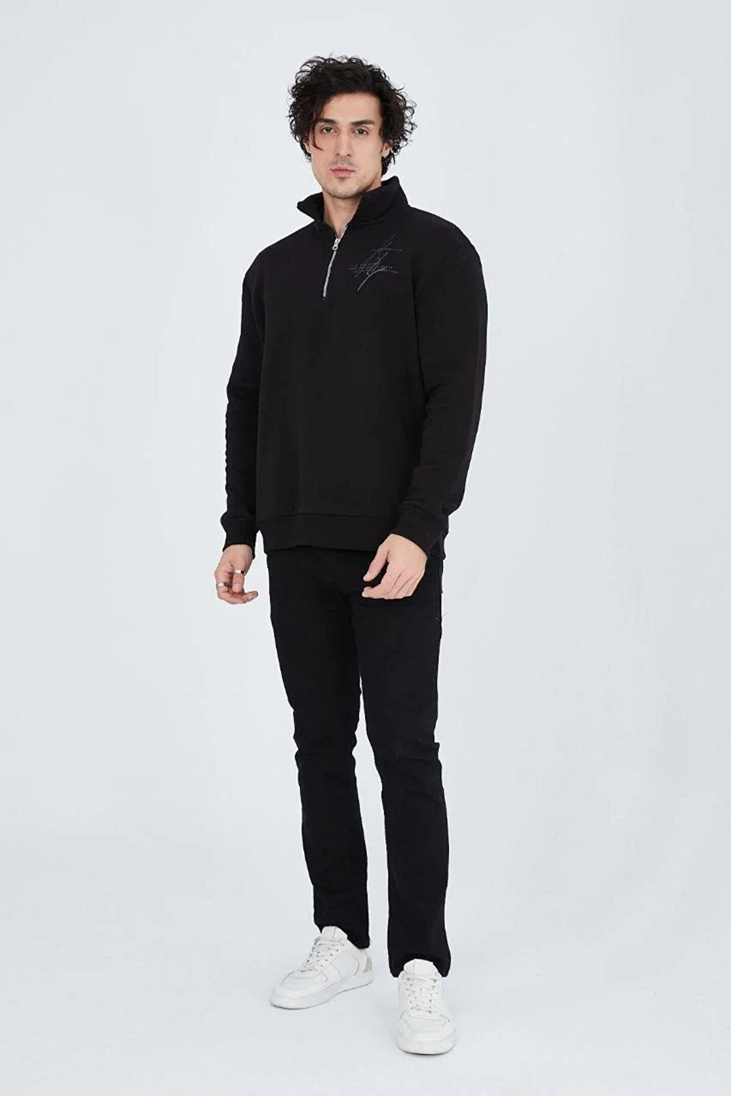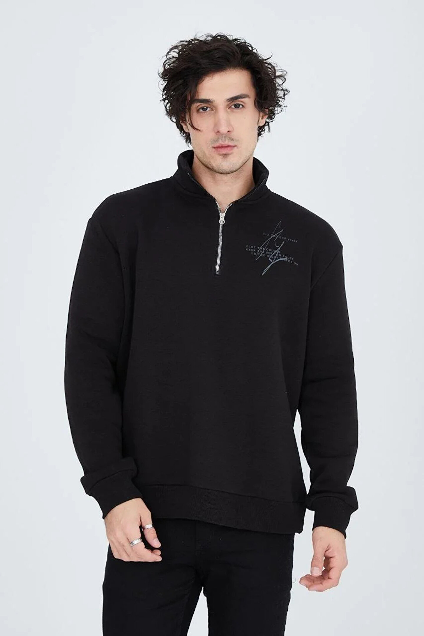 Silerra Erkek Yarım Fermuarlı Baskılı Sweat - Siyah