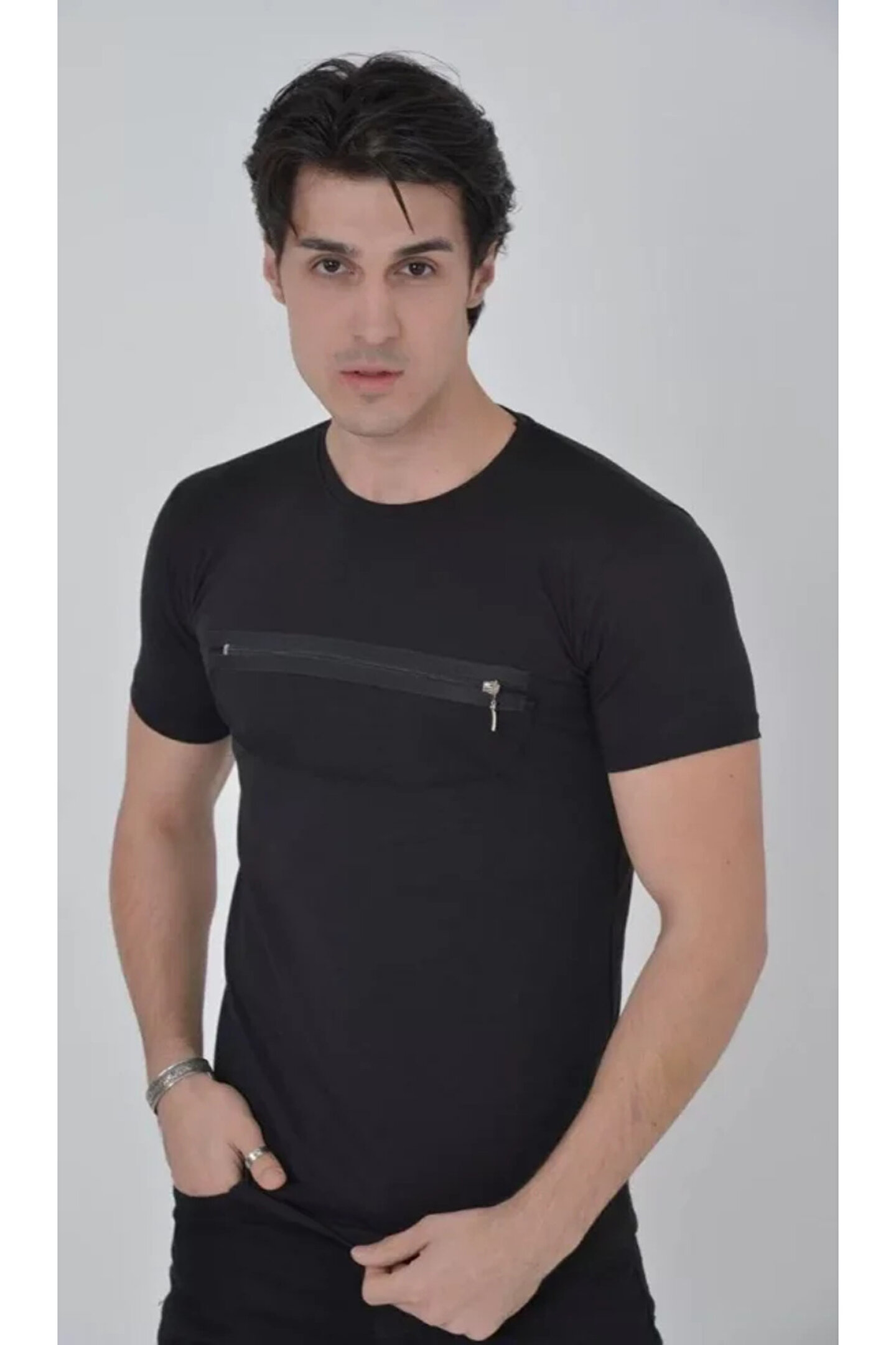 Erkek Göğüste Fermuar Aksesuarlı Dar Kalıp T-Shirt - Siyah