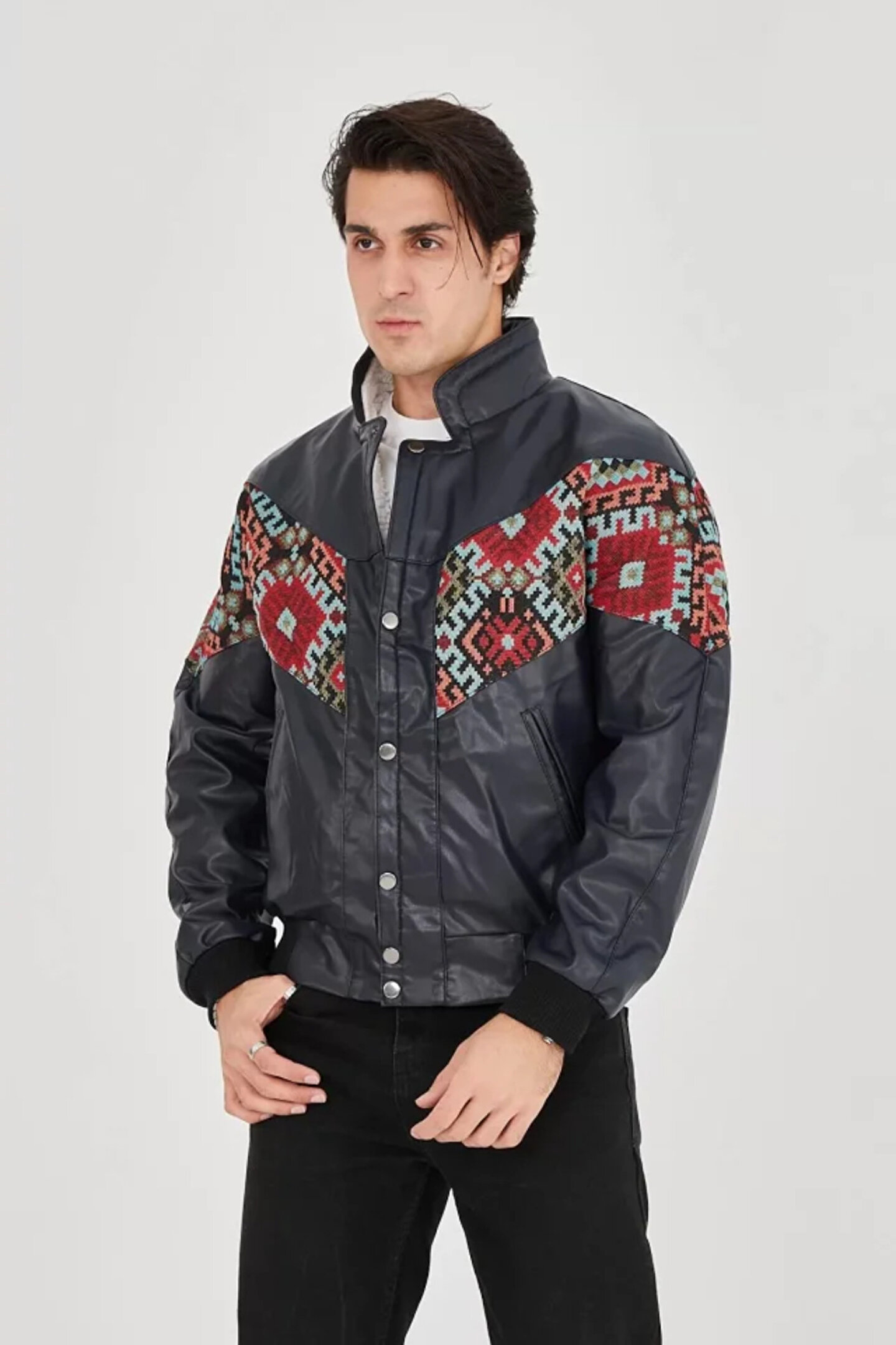 Erkek İçi Astarlı İçten Yaka Kısmı Peluşlu Suni Kumaş Vintage Ceket - Lacivert