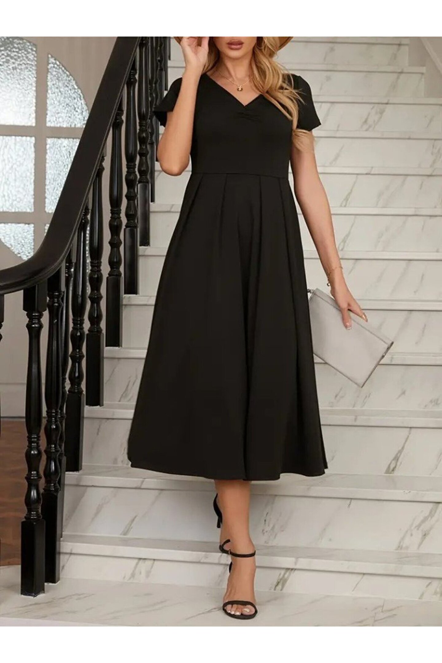 Kadın Kısa Kollu V Yakalı önden Pileli Midi Janjan Krep Elbise