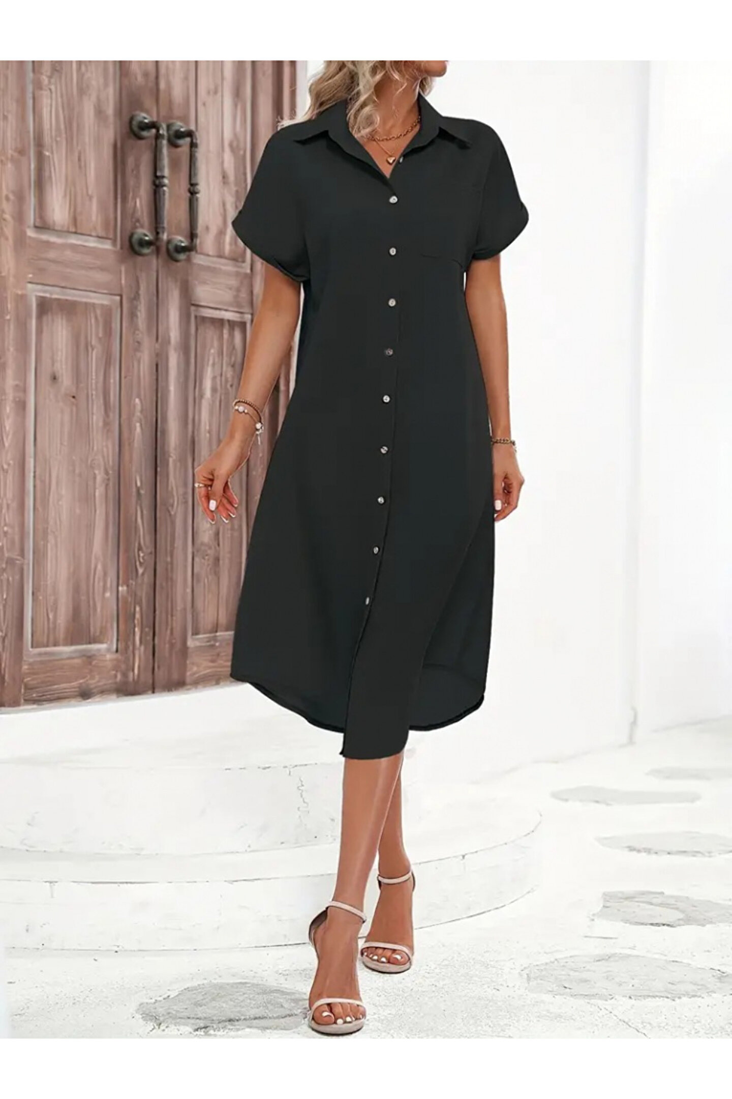 Kadın Kısa Kollu Yakalı Düğme Detay Midi Dokuma Elbise