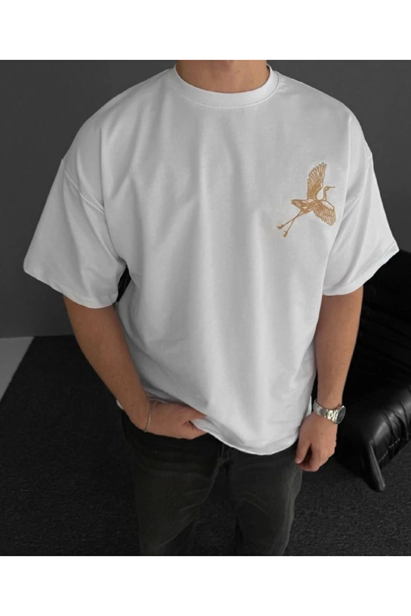 Ön Ve Arka Baskılı Oversize Bisiklet Yaka T-shirt - Beyaz