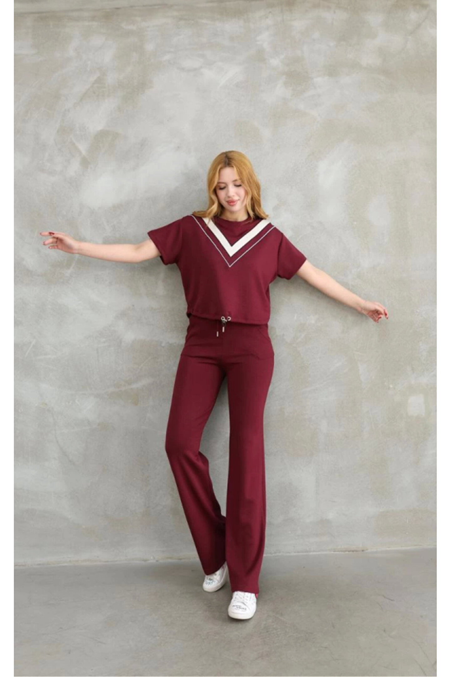 Osy Modal Yumuşak Dokulu Kumaş Bisiklet Yaka Parçalı Detaylı Kısa Kollu Takım - Bordo