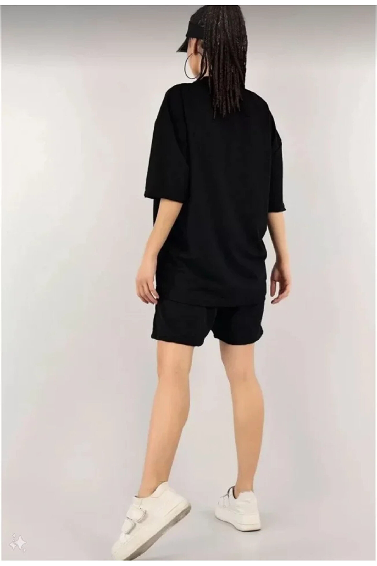 Unisex Nakış İşlemeli Şort Takım - Siyah