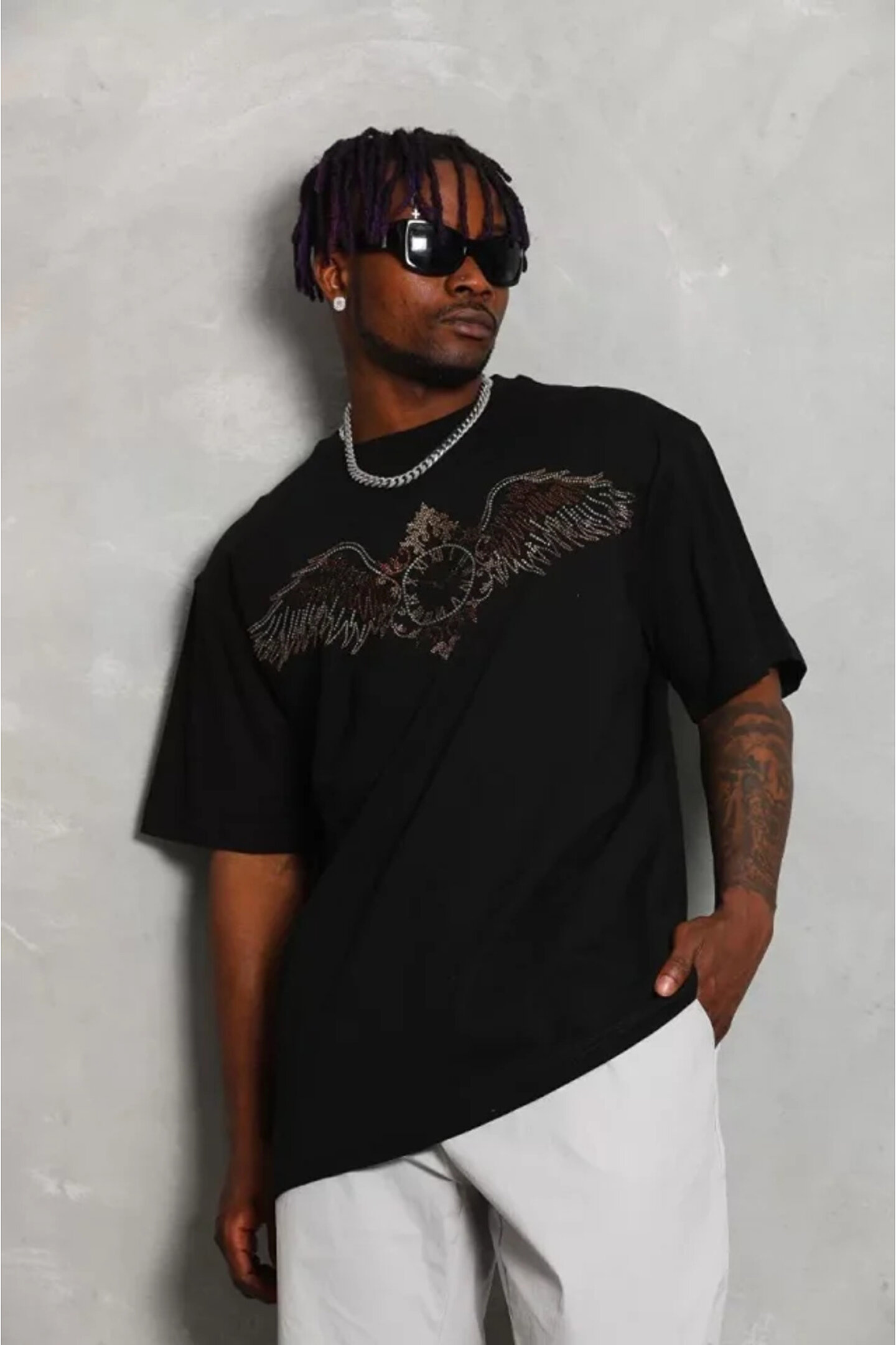 Unisex Oversize Taşlı Bisiklet Yaka T-Shirt - Siyah
